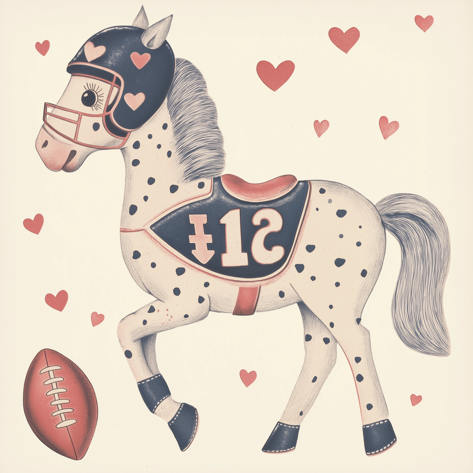 This image features a charming vintage Valentine card showcasing a speckled horse dressed in a navy football helmet and jersey. The background is a pristine white, adorned with pastel hearts, evoking a nostalgic 50s style.