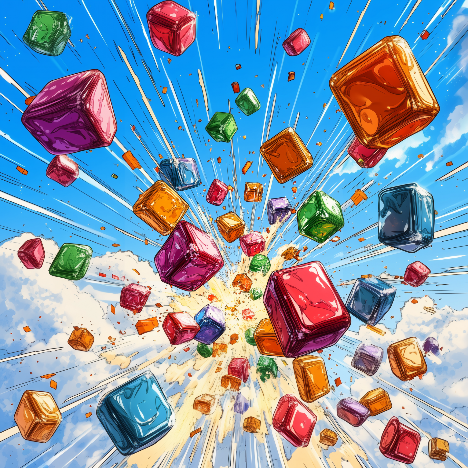 This illustration features a vibrantly colored array of square Starburst candies in a comic book style. The dynamic colors and playful design create an energetic and fun atmosphere.