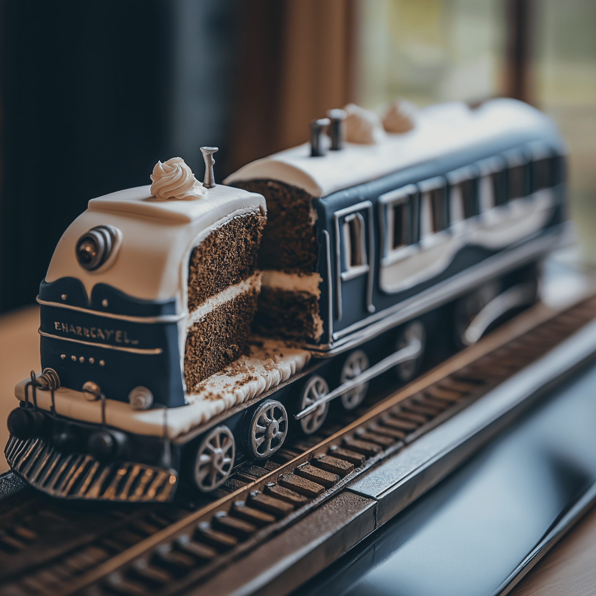 The image showcases a beautifully designed train-shaped cake in dark blue, white, and silver hues, with a slice cut out revealing its delicious interior. The scene is set in an office environment, with a blurred background that emphasizes the cake's intricate details.