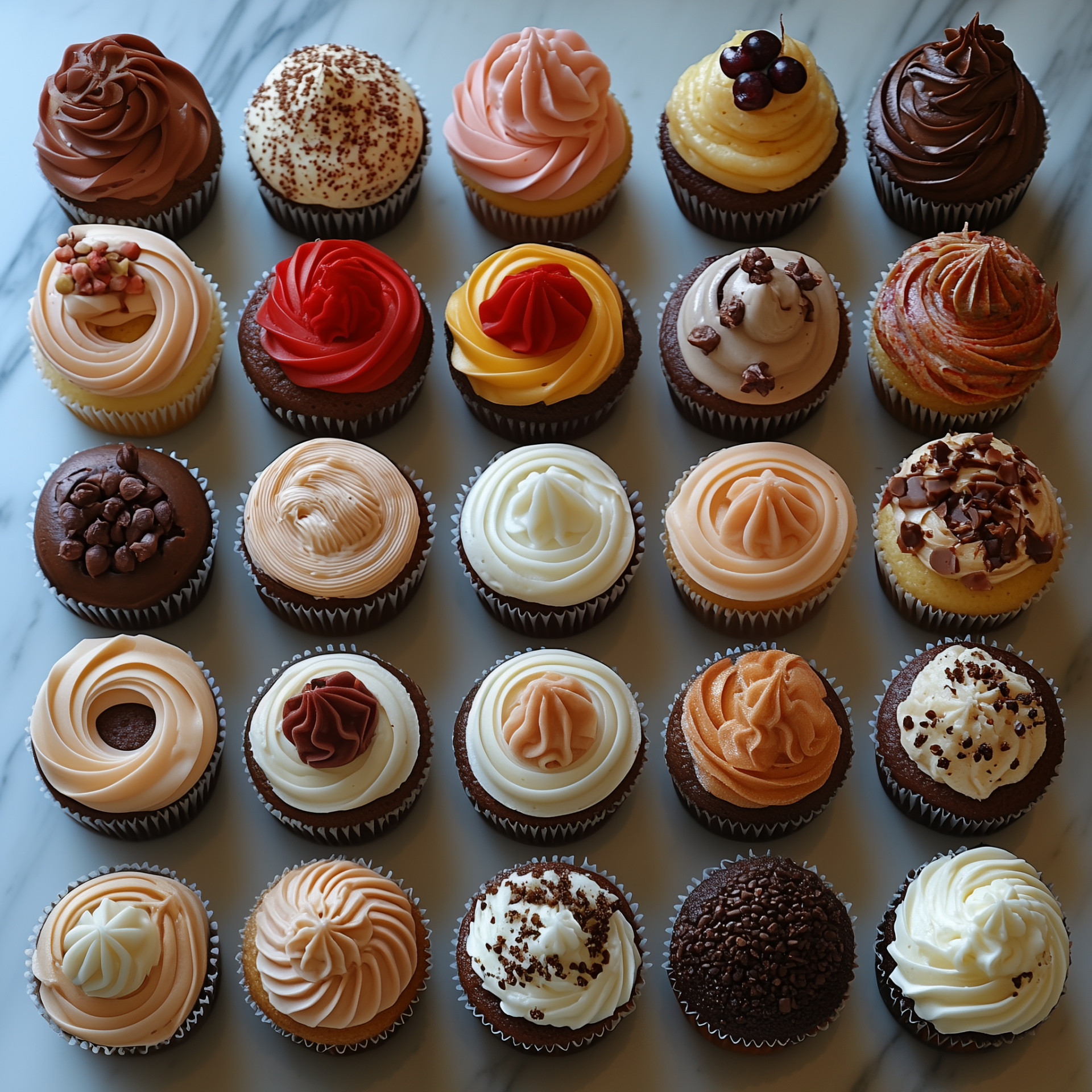 This image showcases a minimalist arrangement of 30 stunning cupcakes, displayed from top to bottom in an organized manner. The colors and designs of the cupcakes create a visually pleasing and harmonious effect.