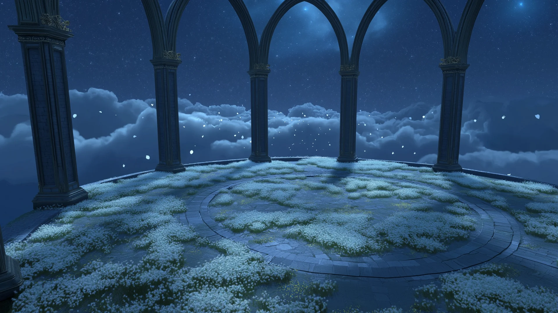 A sci-fi fantasy scene featuring a large muscular tiefling in chains on a floating disc platform, surrounded by knights escorting on either side. The artwork has a symmetrical and centralized composition, with a zoomed out perspective capturing the wind in the background.