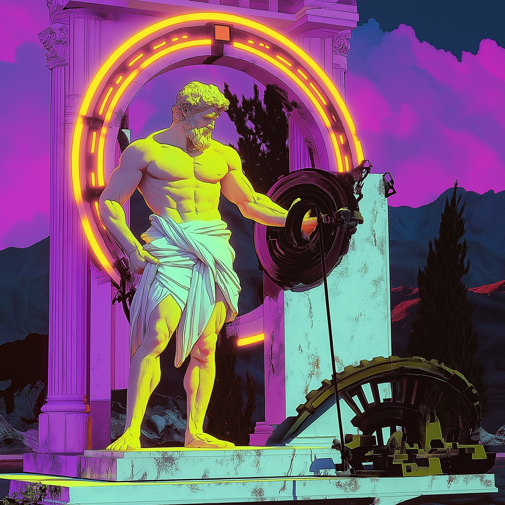 This illustration features an antique sculpture of Hephaestus set against a vibrant synthwave backdrop. The scene is filled with neon colors, flowing liquid, and intricate gears, creating a futuristic yet classical aesthetic.