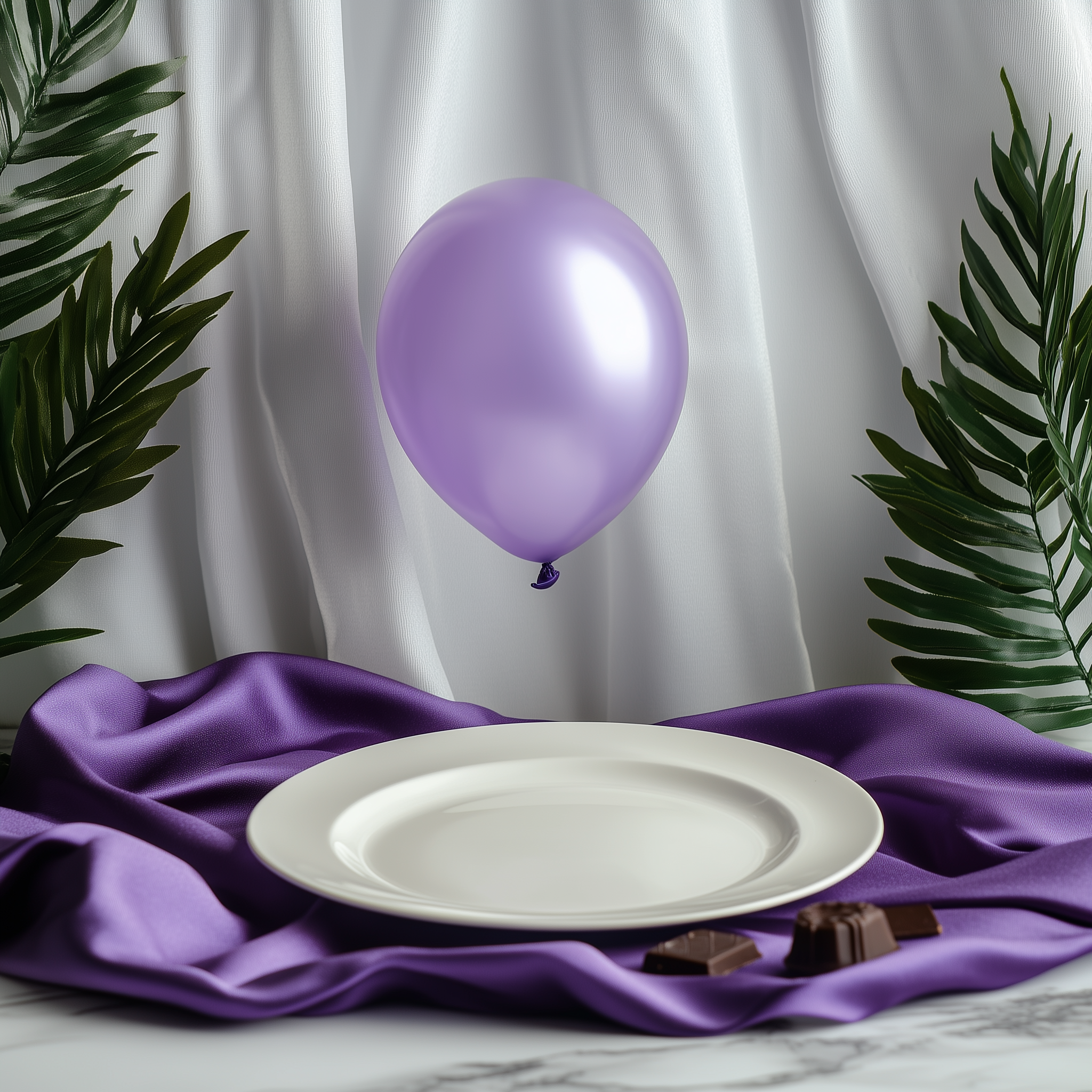 The image showcases an elegant dining table setting featuring an empty plate adorned with decorative items. A vibrant purple balloon and a rich green plant add a pop of color against a clean white background.