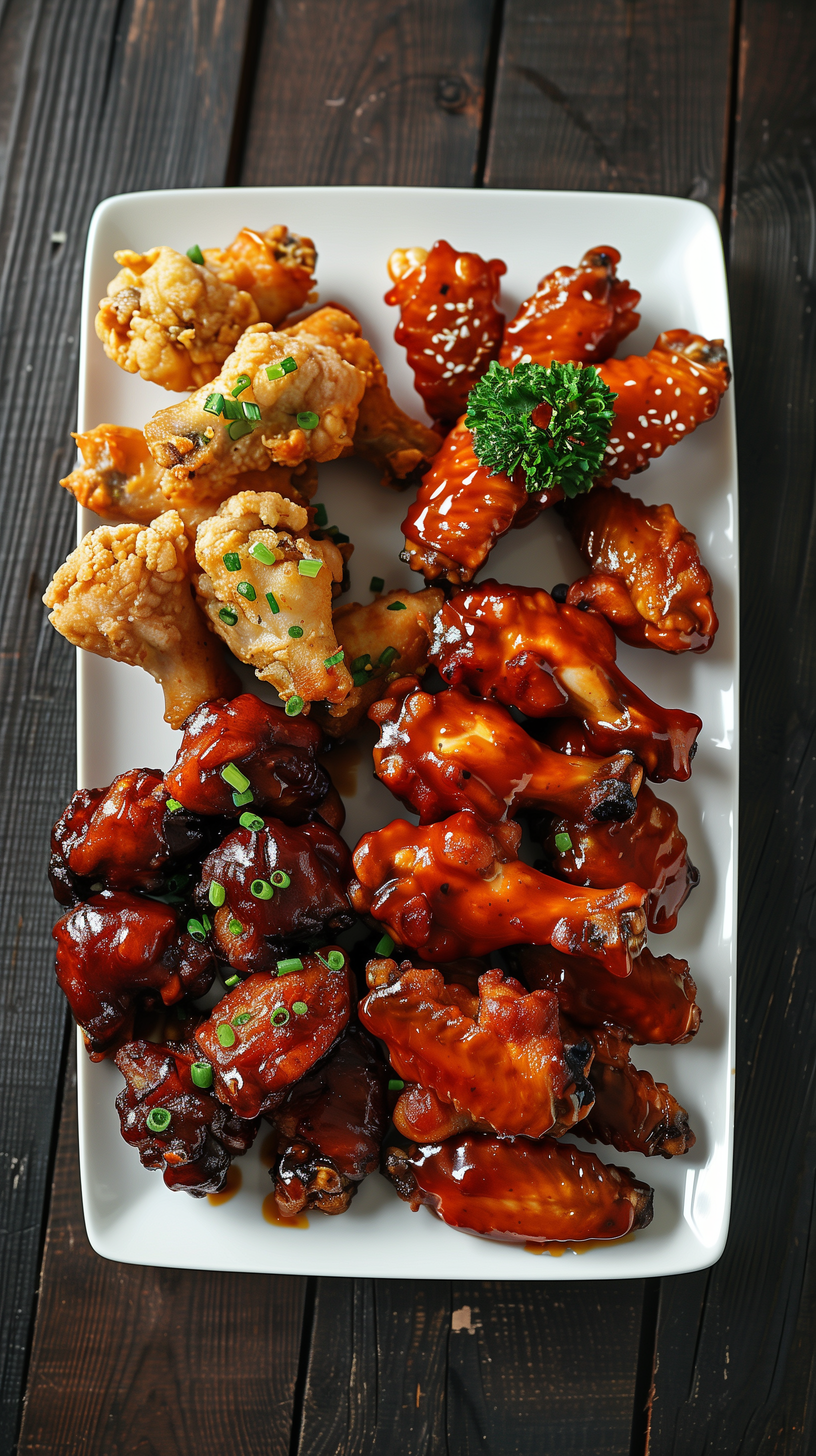 A selection of chicken wings in different flavors beautifully arranged on a white plate atop a dark wooden table. The presentation exudes a professional and appetizing quality, with each wing carefully positioned in the center of the frame, capturing them in a realistic and inviting manner.