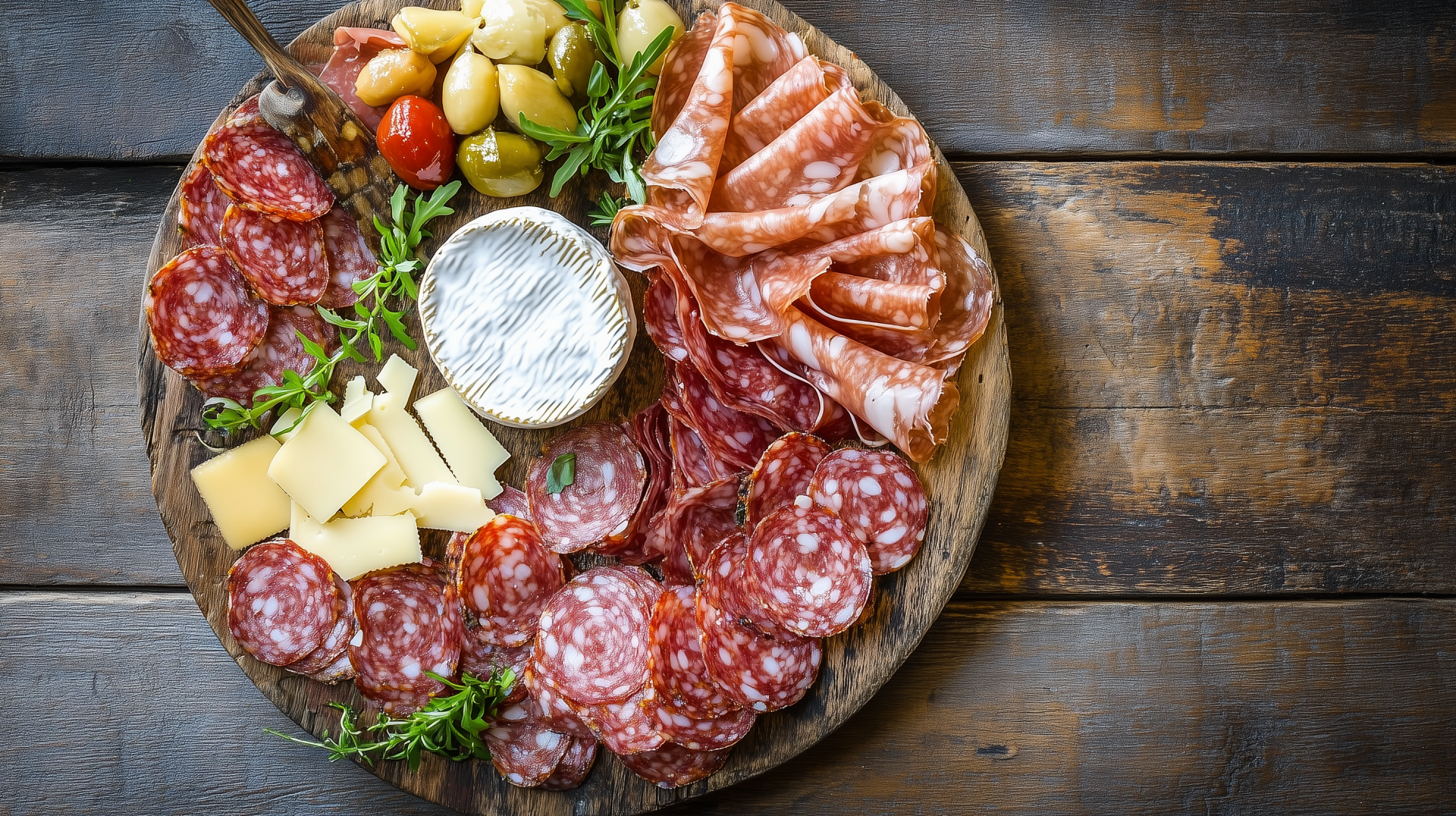 This image showcases an appetizing arrangement of cold cuts and cheeses beautifully presented on a round flat plate. The rustic table setting adds warmth and charm, typical of an Italian dining experience.