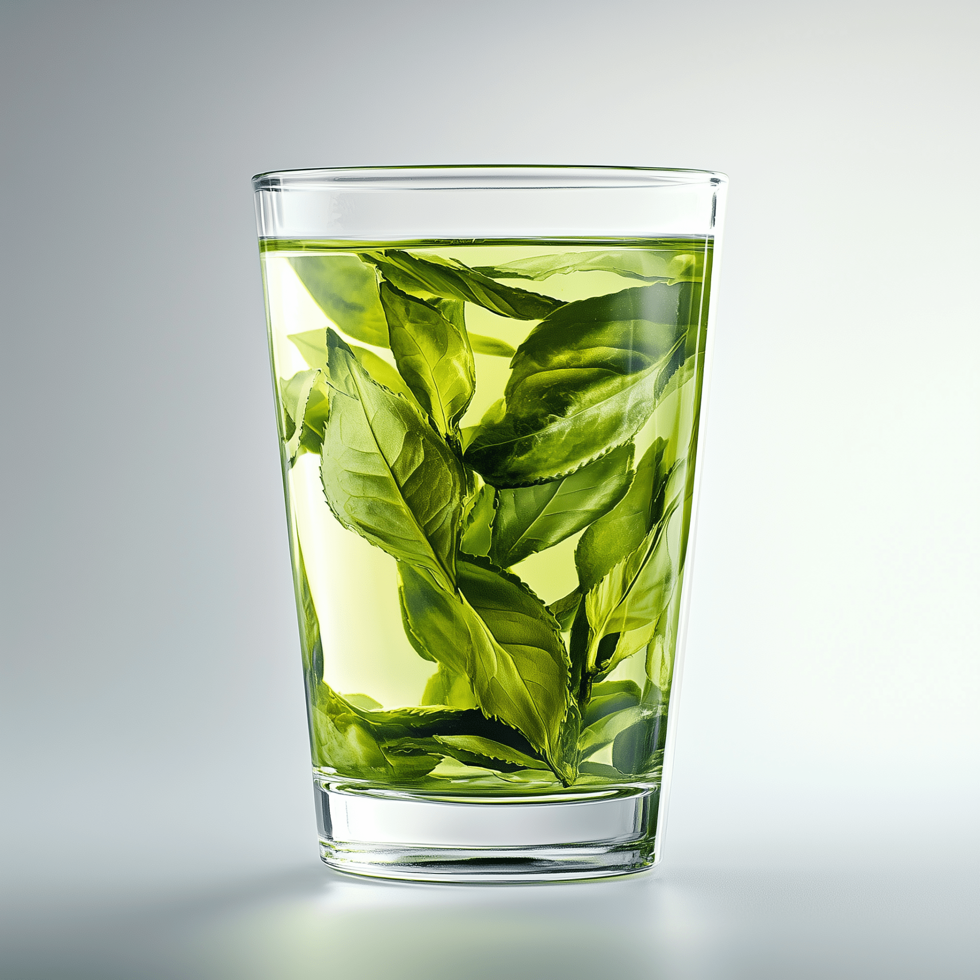 This image showcases a hyper-realistic depiction of green tea leaves steeped in a glass. The contrast of the vibrant green leaves against the blank background highlights the serene and refreshing nature of the tea.