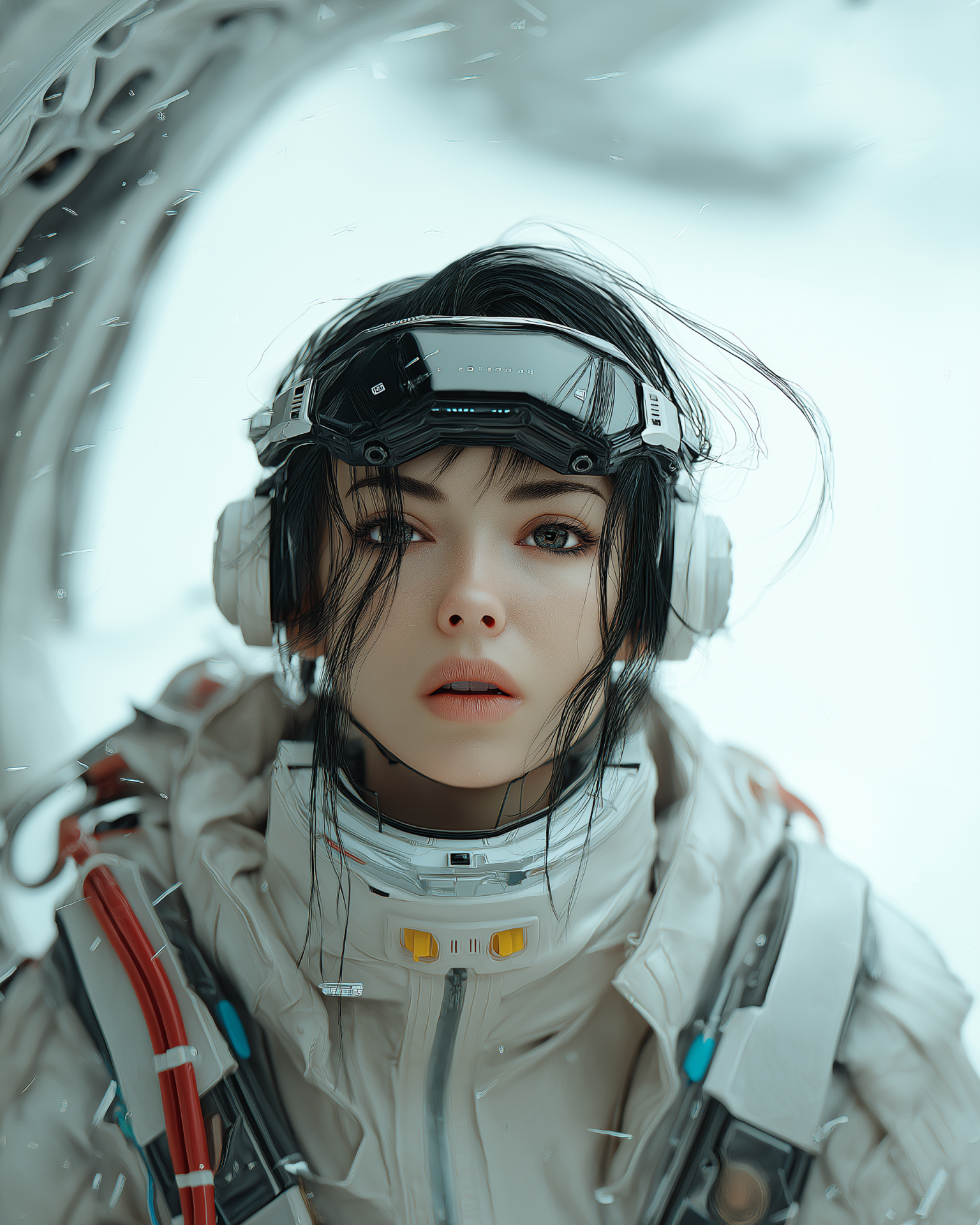 This image showcases a full body and head portrait of a cyberpunk character surrounded by advanced tech equipment. The vibrant colors and intricate details create a futuristic atmosphere that captures the essence of a digital world.