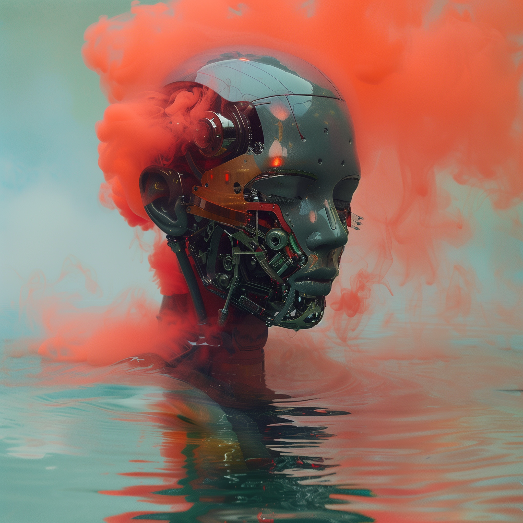 This striking portrait captures a robot partially submerged in water, with a reflection that reveals its android features. Soft red smoke adds a mysterious atmosphere, enhancing the low-key photography style.