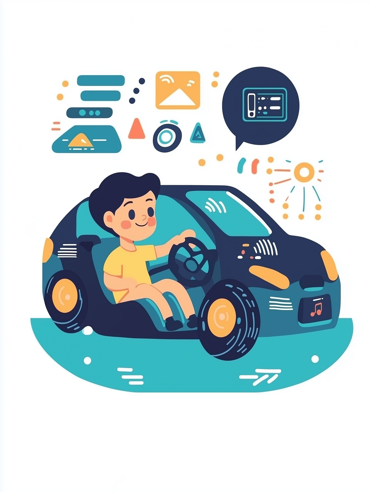 This illustration captures a simple and minimalistic representation of autonomous driving. It features a child with black hair, conveying a sense of wonder and future possibilities in technology.