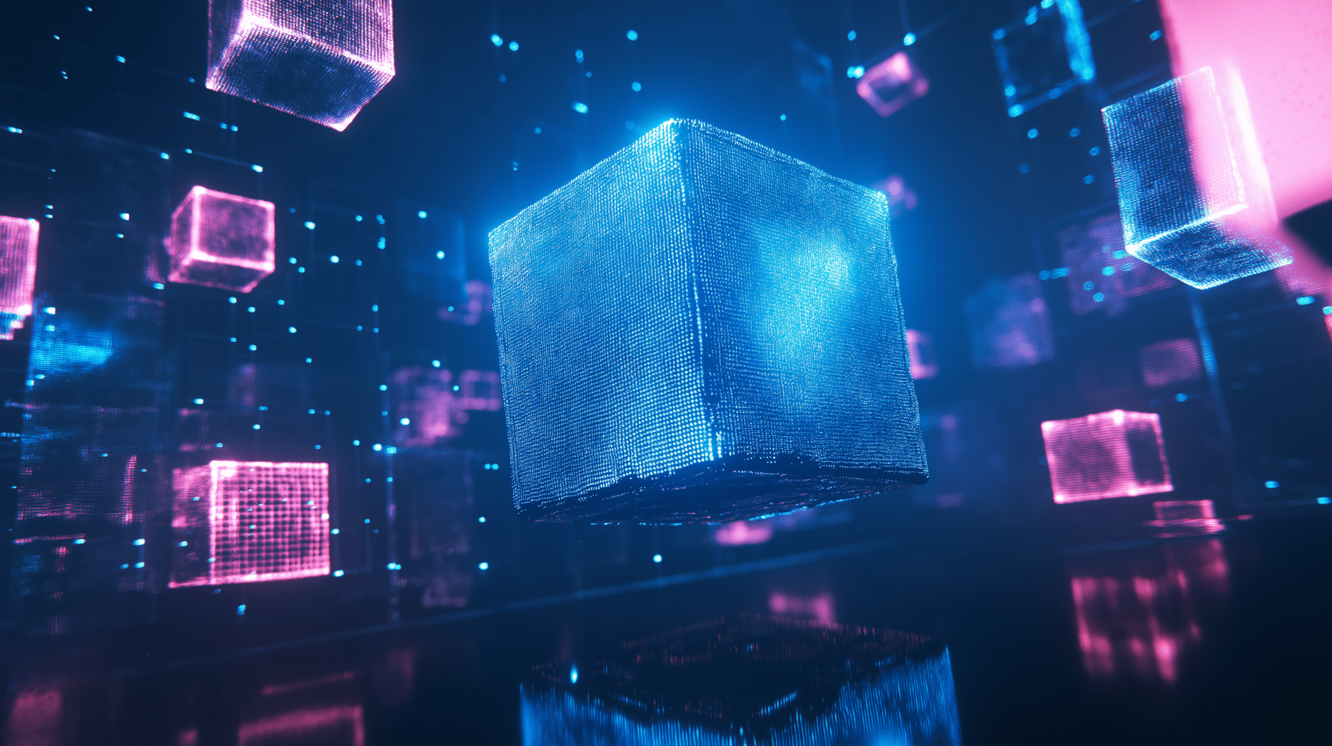 The image showcases a futuristic 3D network of interconnected cubes that represent blockchain technology. A large glowing blue cube stands prominently in the foreground, surrounded by a complex array of softly illuminated cubes in pink and blue hues.