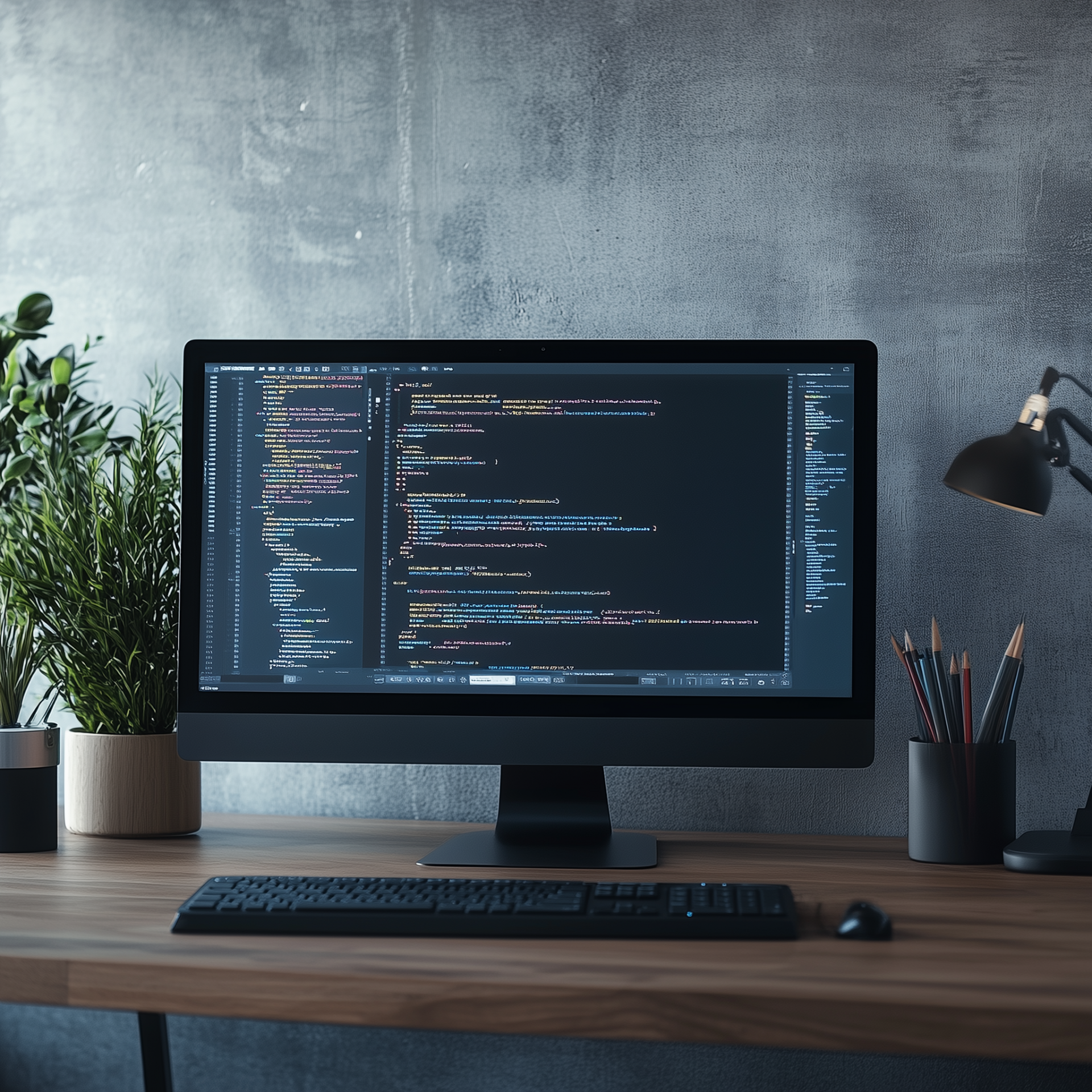The image features a sleek modern computer monitor paired with a minimalist keyboard, resting on a desk against a neutral gray wall. The screen is filled with a vibrant development environment, giving a tech-savvy feel to the workspace.