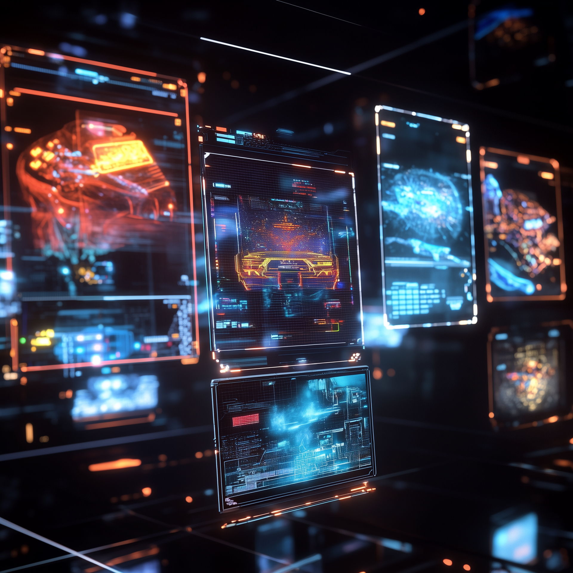 The image features futuristic, floating holographic screens showcasing various video game interfaces against a sleek black background. The vibrant colors and dynamic designs create an immersive and high-tech atmosphere.