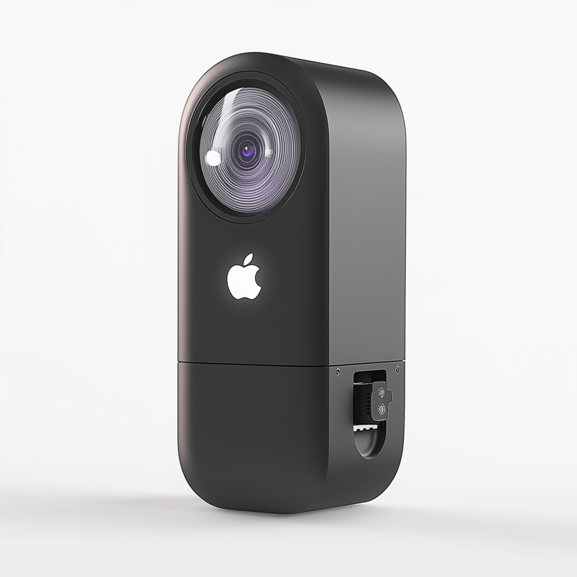 This image showcases a hyper-realistic, pocket-sized projector with a sleek dark aluminum finish and a glass top. The device features a small Apple logo and is supported by a minimal rail, all presented against a clean white background.