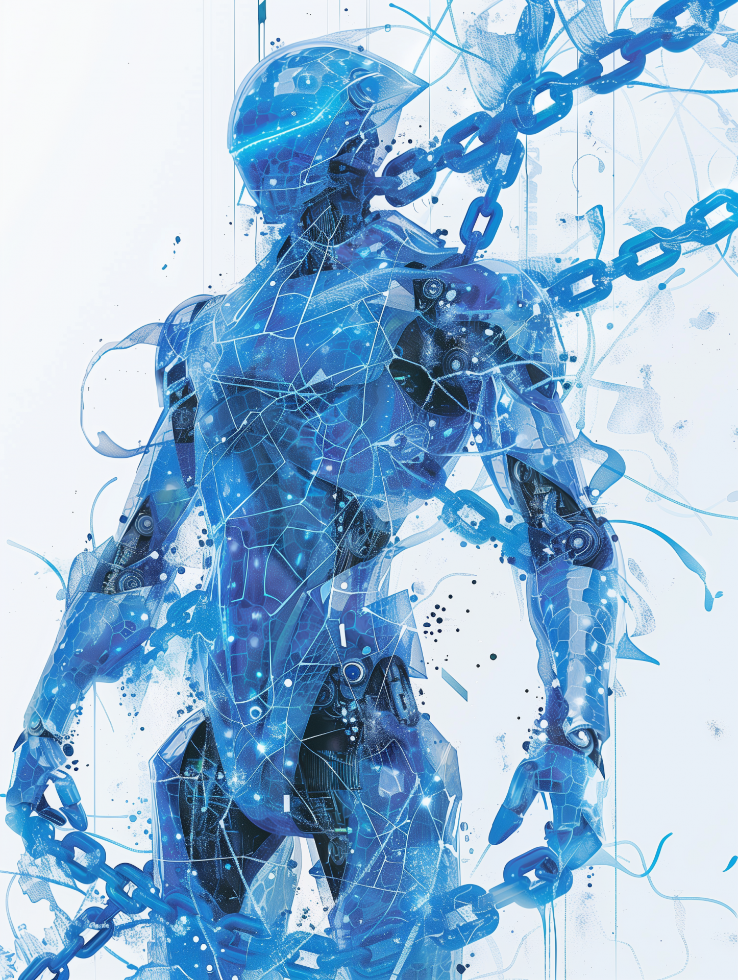 This image features a striking blue chain with transparent elements and intricate electronic lines that evoke a high-tech vibe. Set against a clean white background, it creates a futuristic ambiance, particularly with the robot positioned nearby.