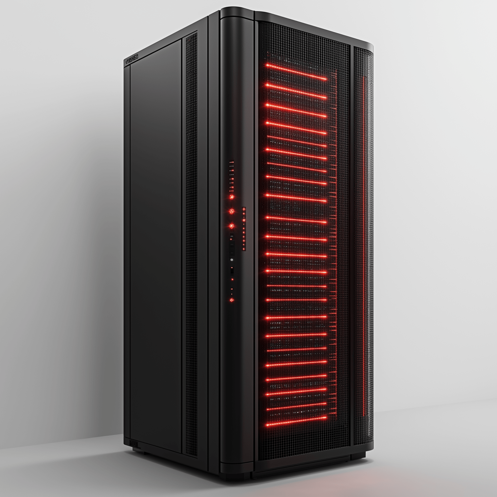 The image features a hyperrealistic server rack set against a pure white background. The dark, matte aluminum material showcases a minimalist design, enhanced by subtle illumination that suggests active data processing.