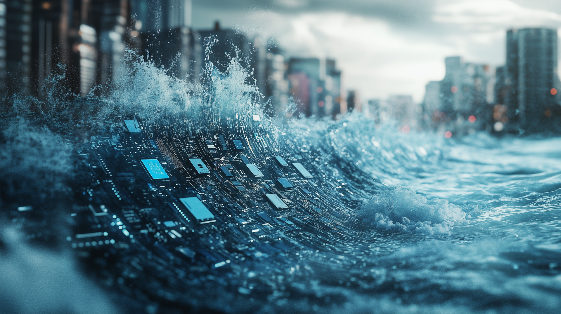 This image features a hyper-realistic scene of a turbulent river, symbolizing a flow of data, with intricate details of AI elements and computer chips in the foreground. The overall atmosphere conveys a sense of chaos and energy, capturing the essence of modern technology.