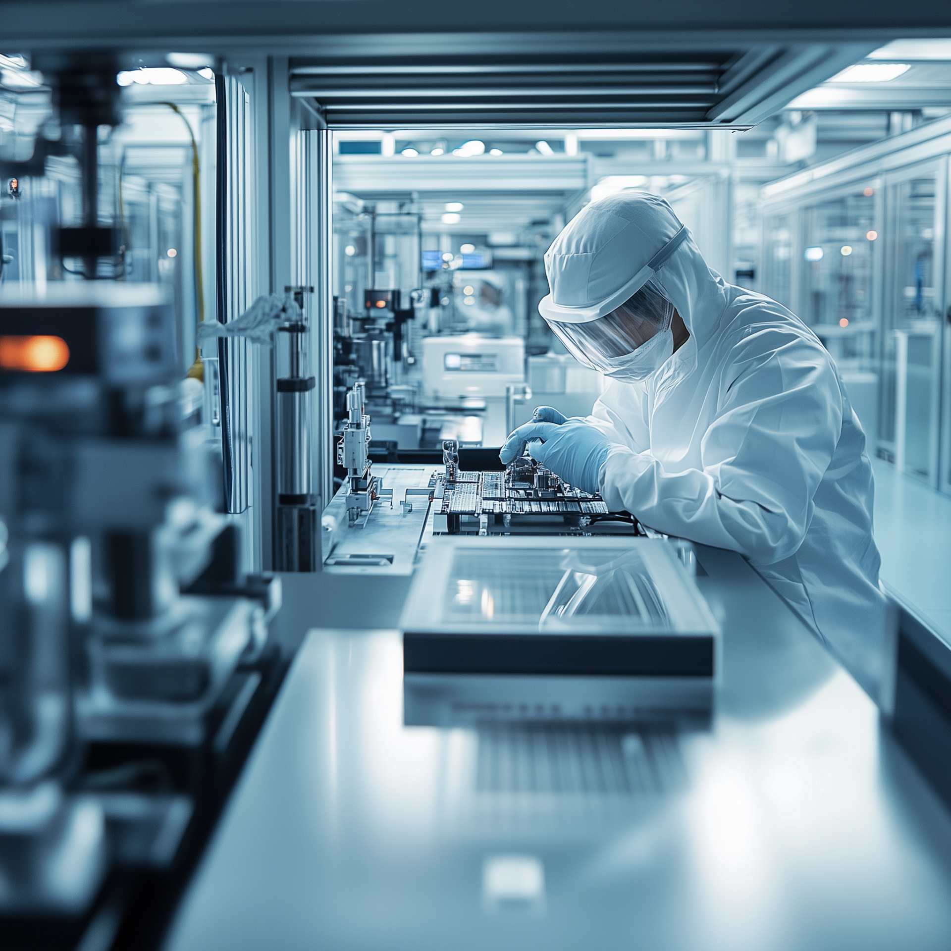 The image captures a focused employee working inside a clean and high-tech semiconductor fabrication facility. With protective gear and equipment in view, it showcases the precision and concentration required in this advanced industrial environment.