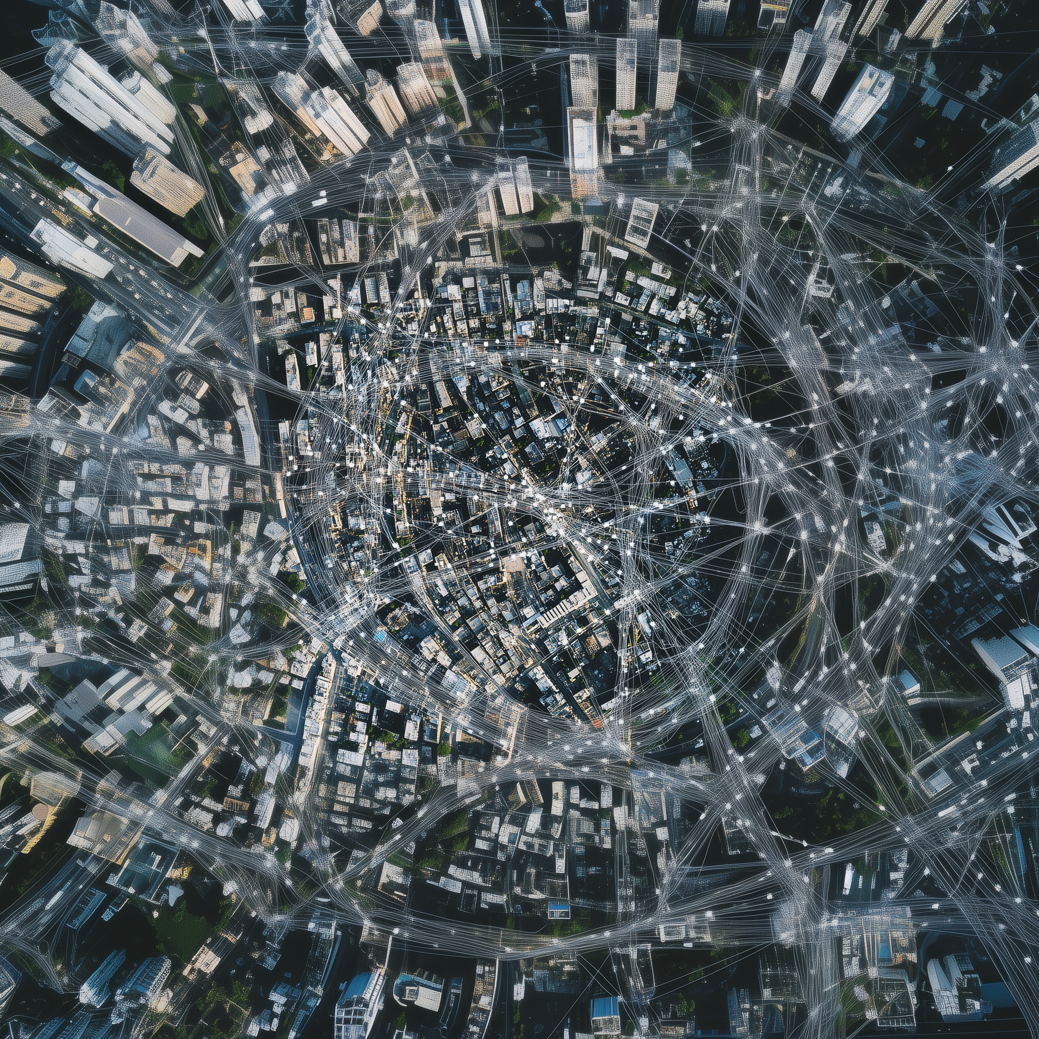 This image showcases an aerial view of interconnected cities with a neural link visual effect. The vibrant colors and intricate lines create a sense of connectivity and technology, portraying a futuristic vision of urban landscapes.