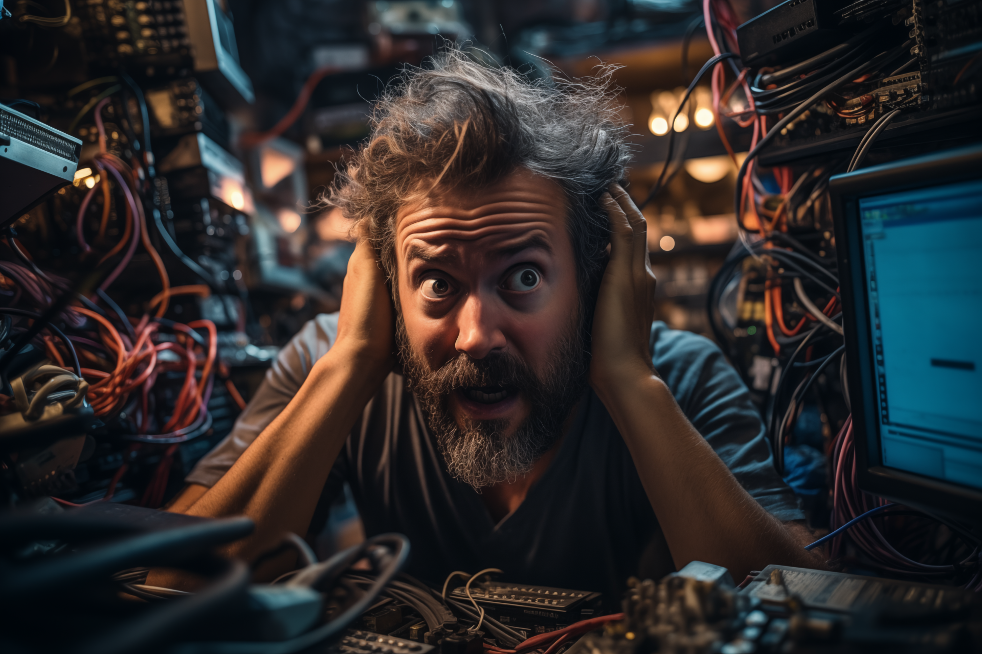 The image depicts a frustrated engineer amidst a chaotic workstation filled with tangled cables and computer hardware. His expression conveys deep concentration mixed with a sense of panic as he tackles complex networking challenges displayed on his monitor.