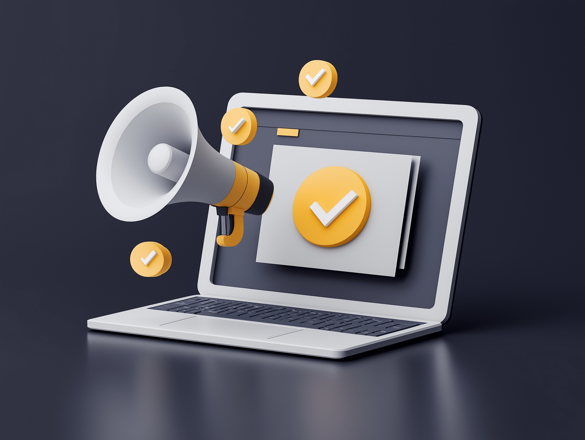 The image showcases a sleek white laptop with its screen opened to display a vibrant website logo. The bright yellow elements provide a striking contrast, creating a modern and engaging visual appeal.
