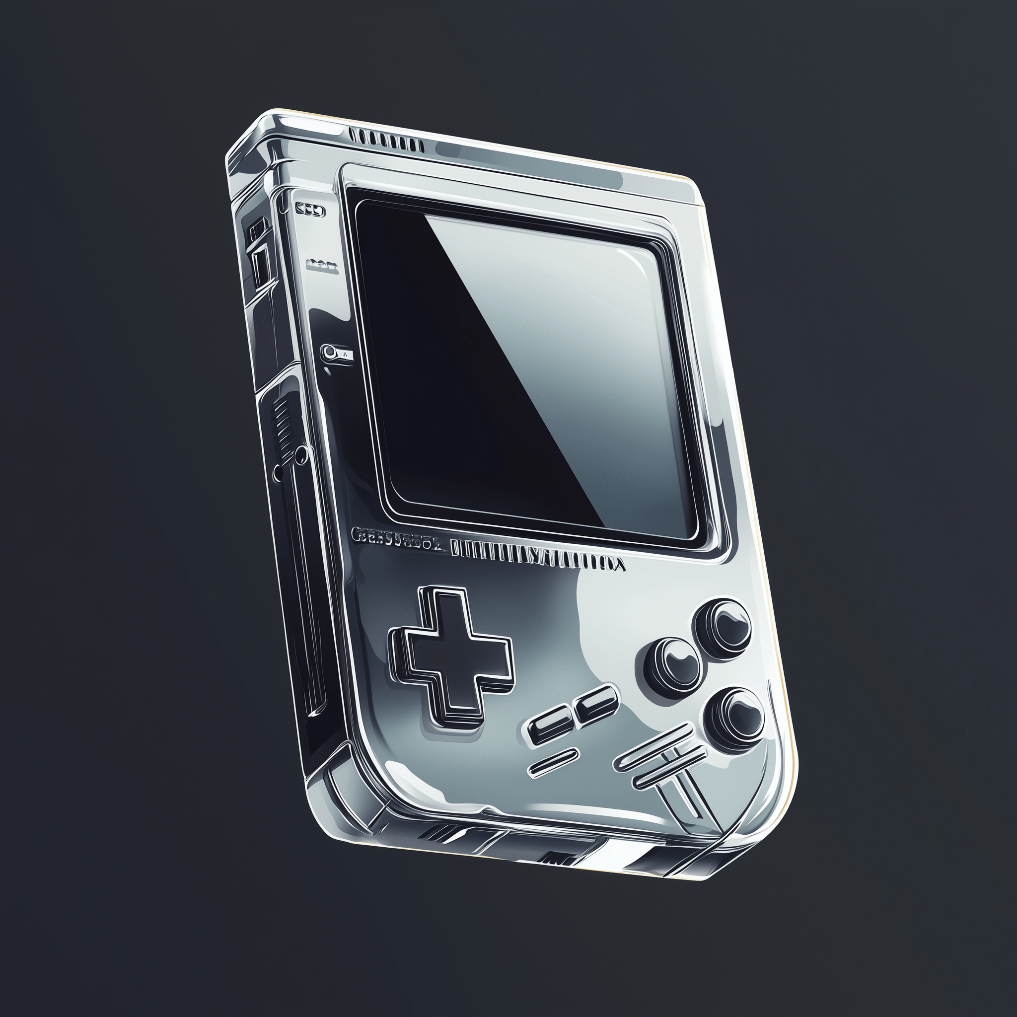 A sleek and modern interpretation of a classic handheld game console, rendered in shiny chrome finish against a deep, mysterious backdrop.