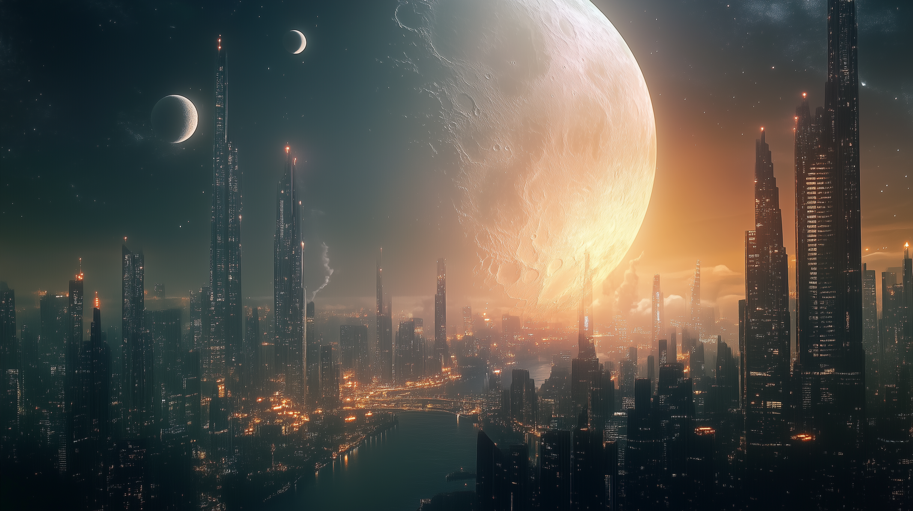 A dense and towering cityscape under a night sky with moons in the background, showcasing a photorealistic urban environment with advanced architectural designs.