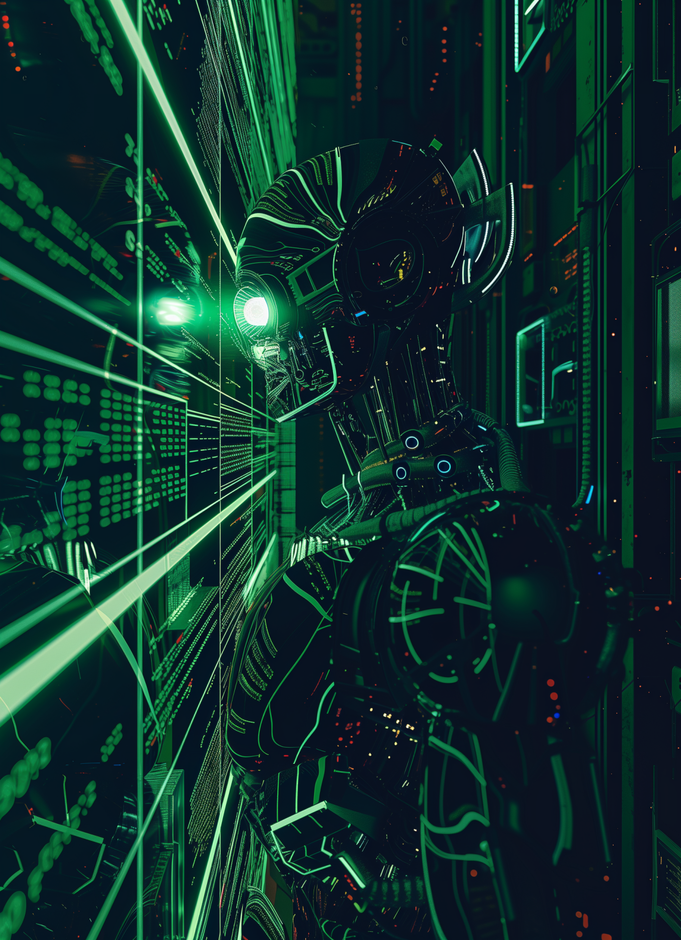This digital art piece showcases an advanced humanoid robot with striking glowing neon eyes. The dark background, along with holographic screens displaying data in green and silver, evokes a cyberpunk atmosphere filled with technological innovation.