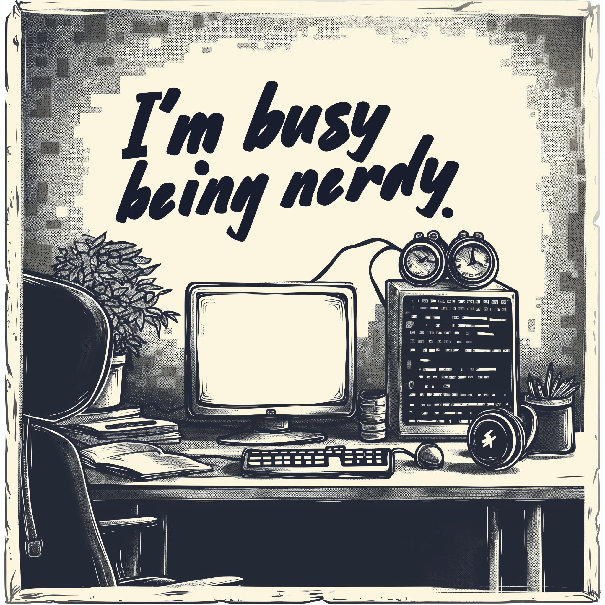 An icon resembling a sketch of a code program running on a computer, featuring a mouse and keyboard. The text overlay reads 'I'm busy being nerdy'.