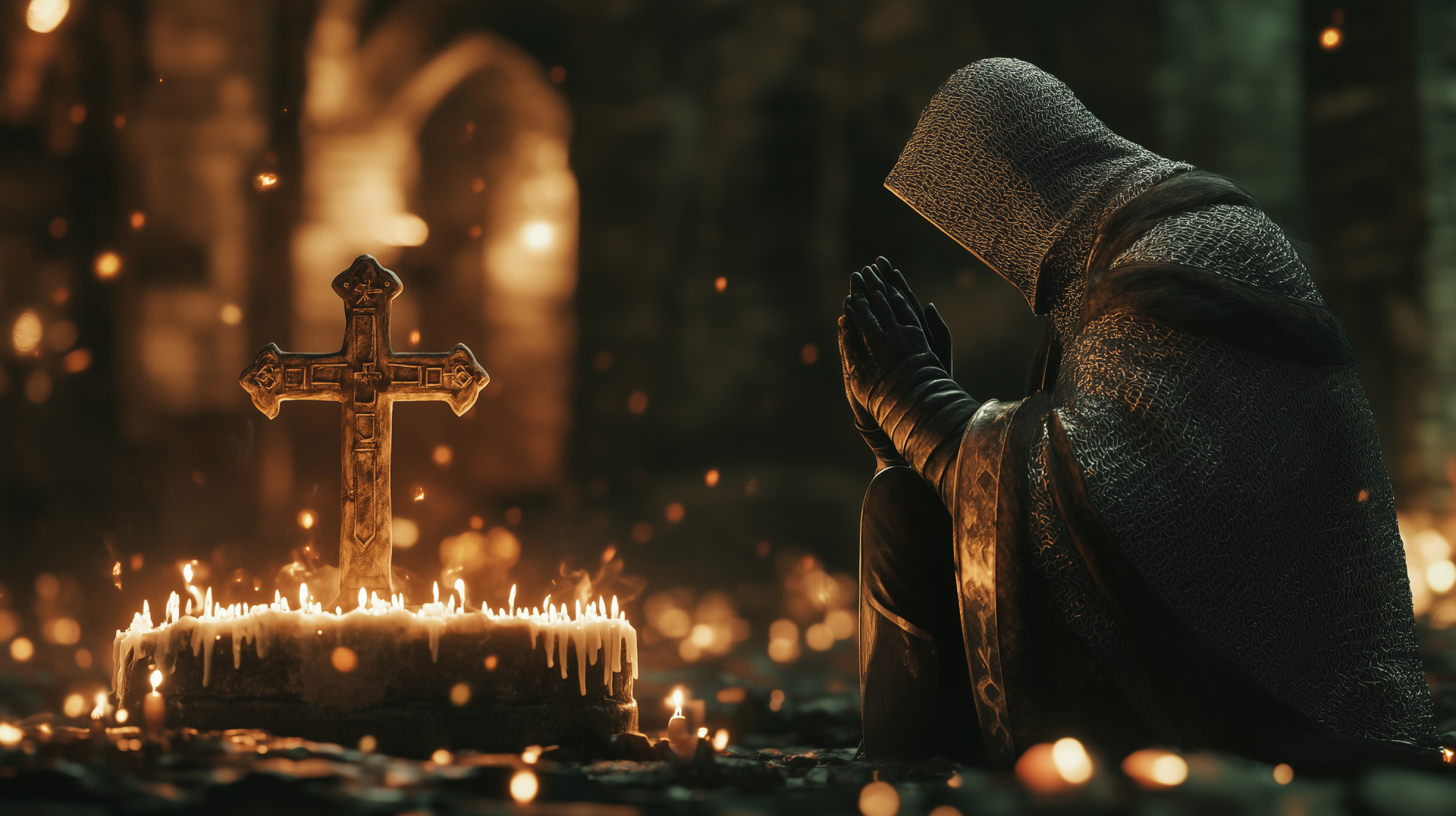 The image features a solemn scene of a knight templar kneeling in prayer, a large cross-shaped candle illuminating the foreground. The ancient cathedral looms in the background, enveloped in a soft bokeh blur that enhances the reverence of the moment.