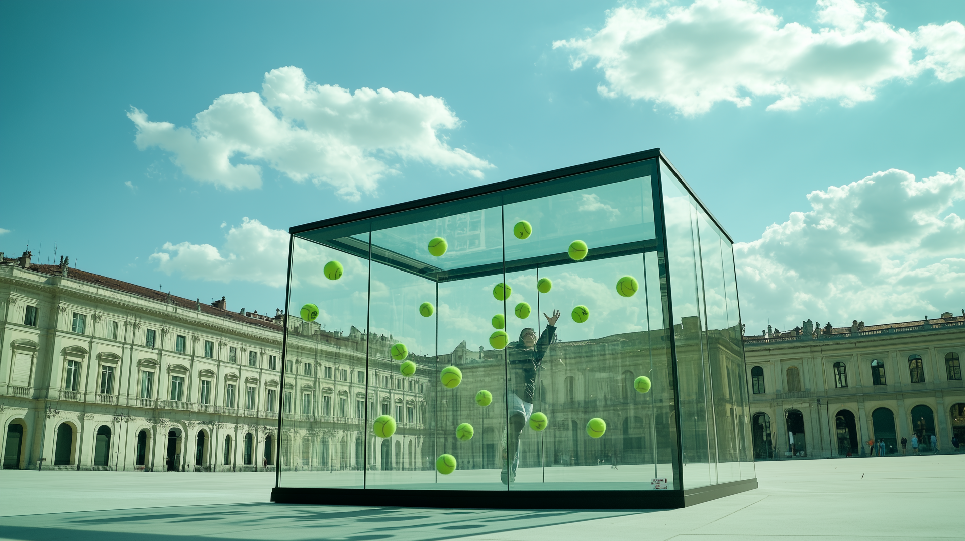 In this lively image, a small glass cabin is seen amidst a beautiful outdoor setting. A person inside appears to be engaged in a playful attempt to catch tennis balls as they fly around, creating an atmosphere of fun and joy.