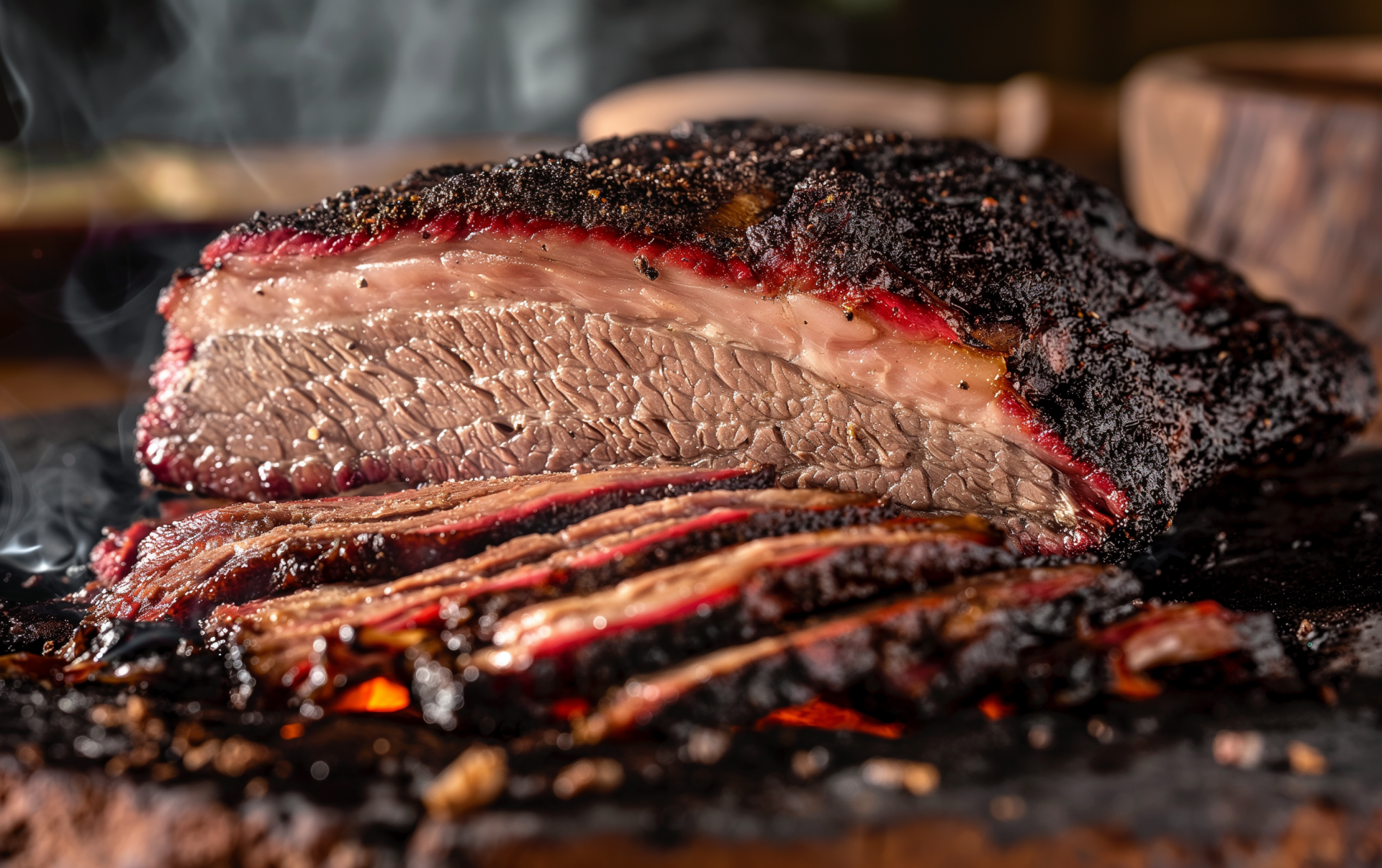 This illustration captures the essence of a Texas BBQ restaurant with a vibrant vintage travel poster style. It features a full packer brisket cooking over a fire pit, evoking a sense of warmth and culinary adventure.