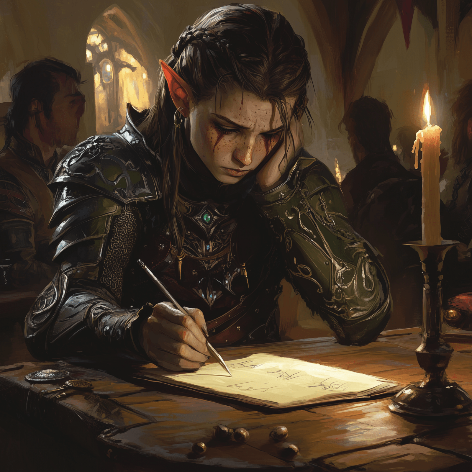 The image captures a tall androgynous high elf in deep contemplation, illuminated by a flickering candle beside them. Their pale skin and dark green eyes contrast with the unkempt hair and chain armor, creating a mystical and introspective atmosphere.