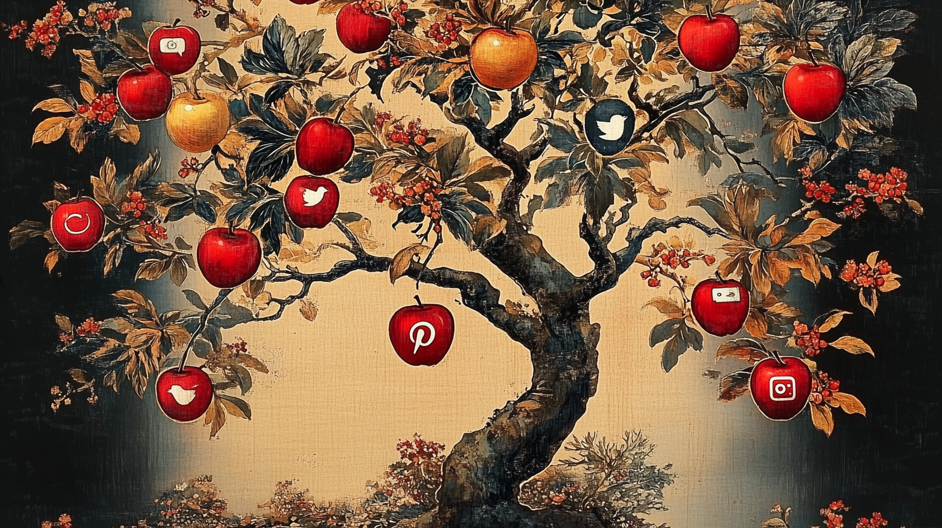 The artwork features a tree with intricately detailed leaves shaped like various social media logos. Influenced by Edo period wood block print techniques, the piece combines traditional art with modern digital themes.