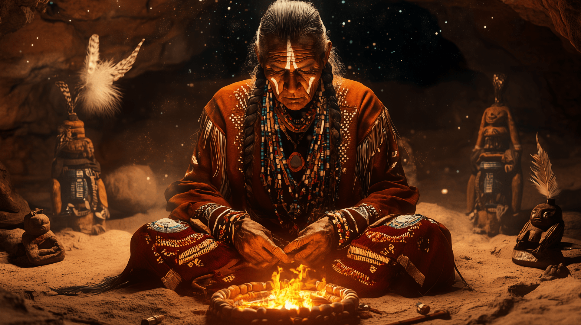 The image depicts a Native American shaman in a peaceful and spiritual setting, engaged in a peyote ritual. Soft flames from the ceremonial fire illuminate his traditional attire and weathered face, creating a warm and mystical atmosphere.
