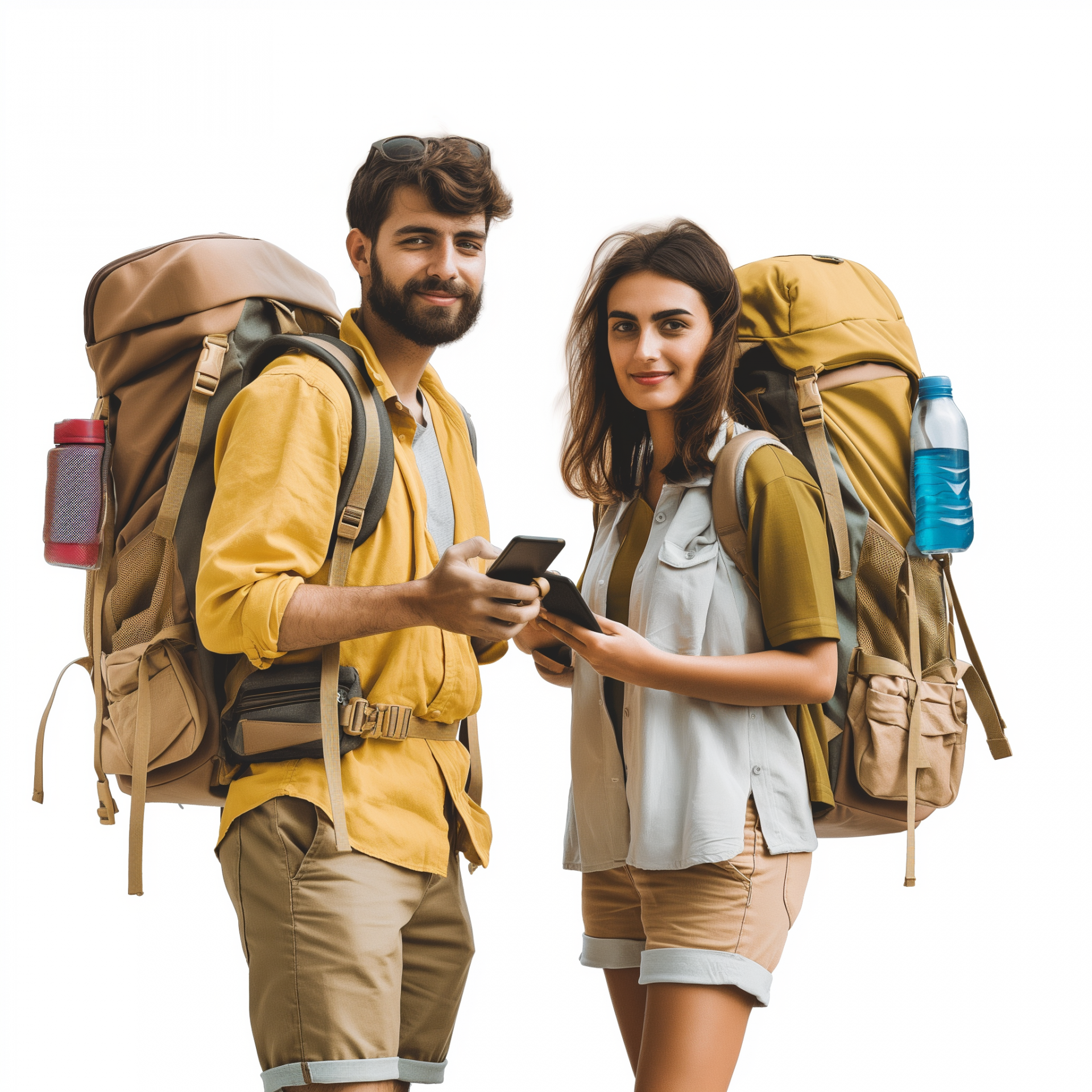 A couple of cheerful tourists stand in front of a white background, both equipped with phones, a water bottle, and backpacks. Their vibrant outfits reflect a sense of adventure and exploration.