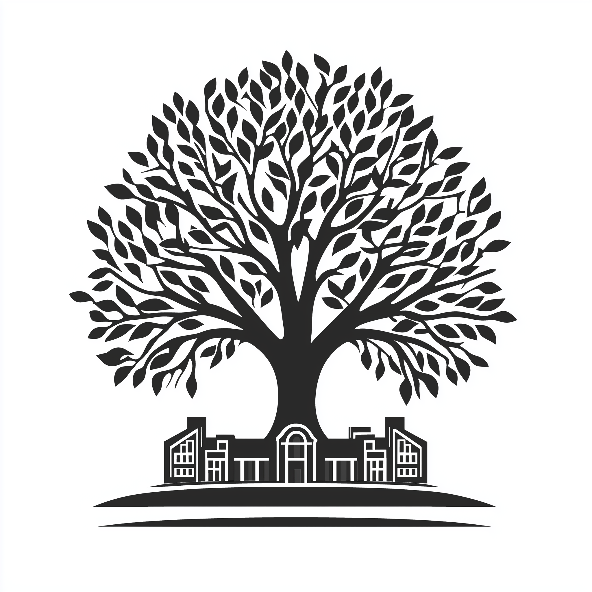 The image features a striking black and white logo that creatively incorporates a large tree, symbolizing growth and strength. The design is simple yet impactful, evoking feelings of tradition and scholastic pride.