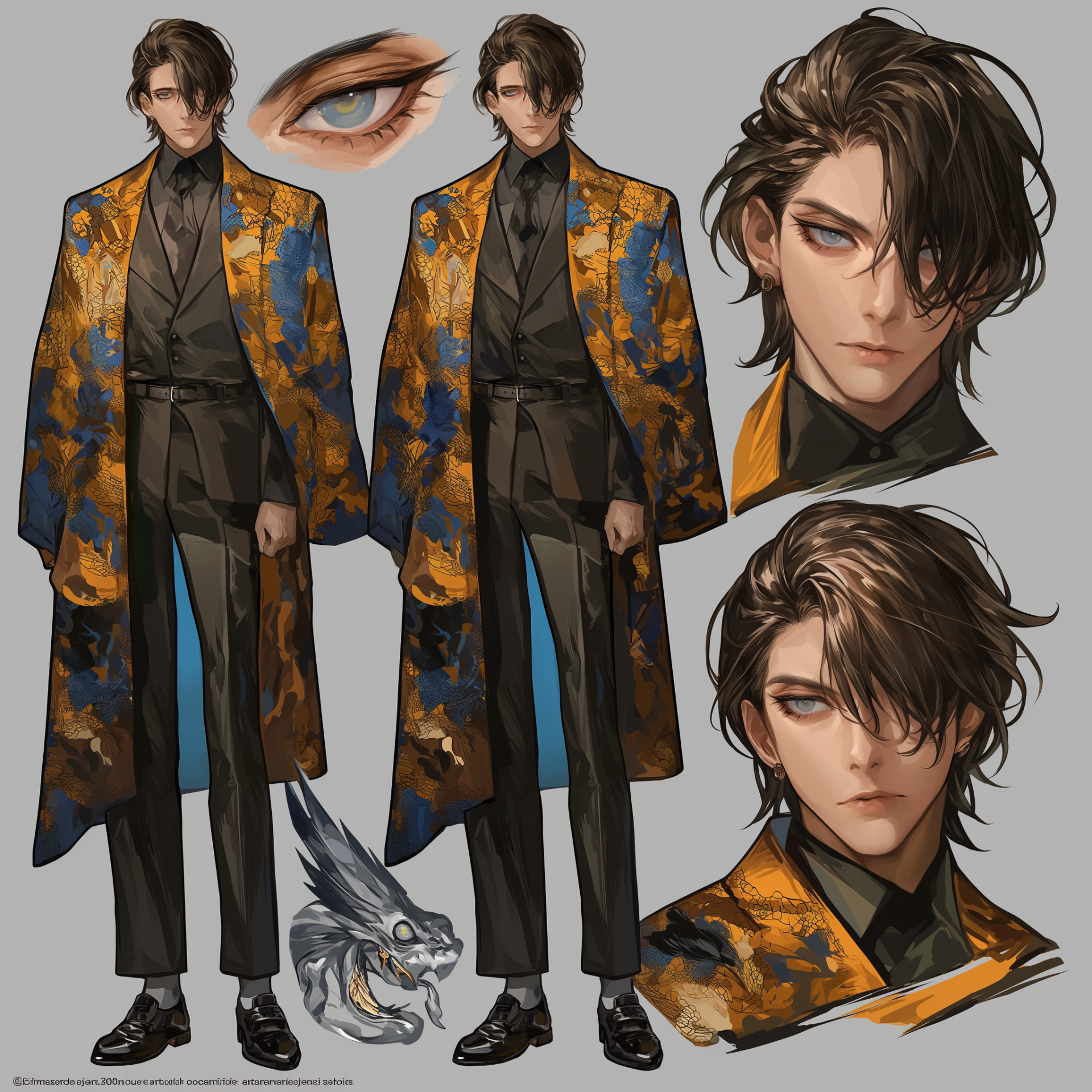 The image features a man dressed in a beautifully patterned suit, showcasing his full body. His brick brown hair and warm gray eyes complement the vibrant patterns of his outfit, creating a striking and fashionable appearance.
