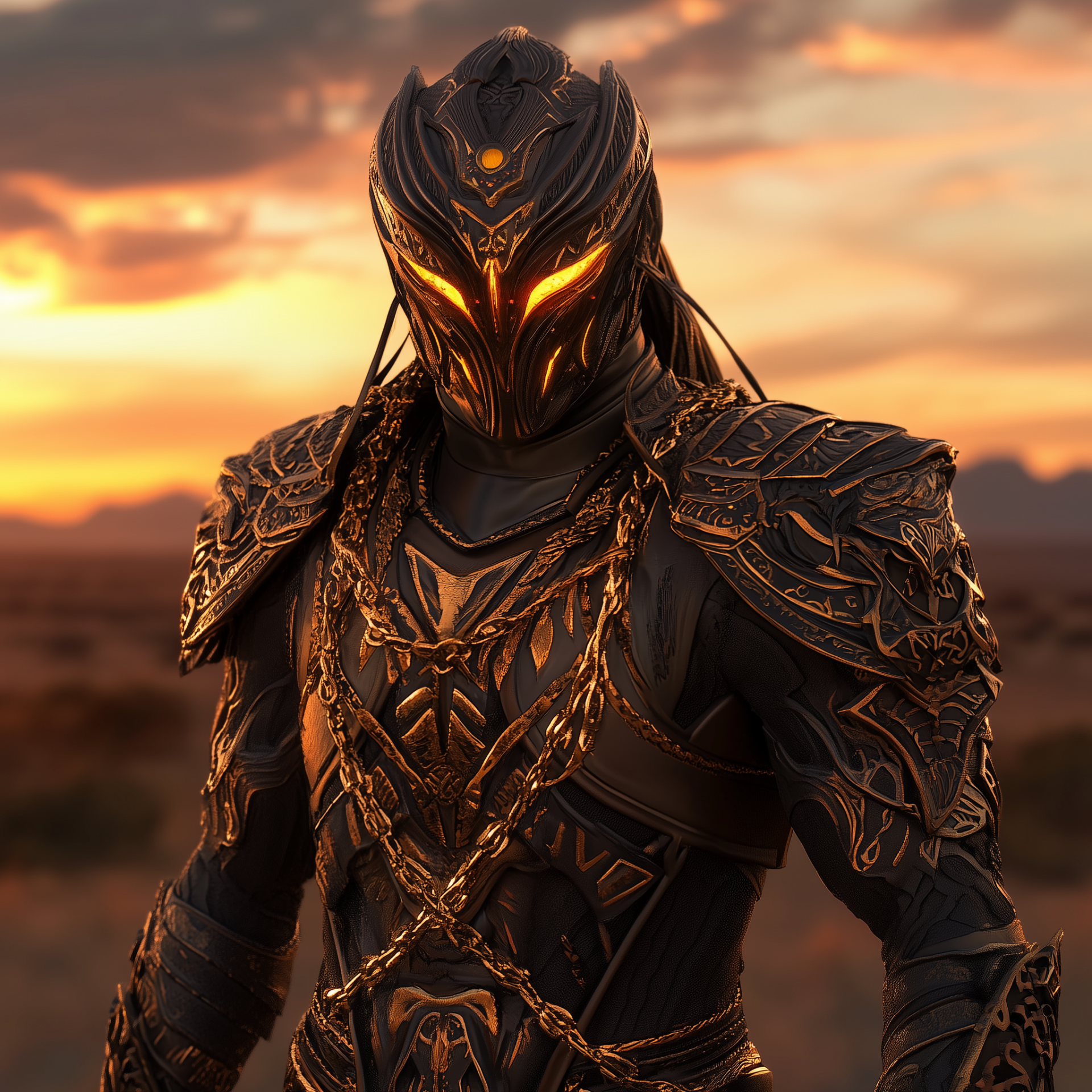 This image features a hyperrealistic scorpion, adorned in dark brown and golden armor, intricately detailed with tribal engravings. The design includes patterns that resemble the acacia tree, and the scorpion's mask features sharp angles and a lion motif.
