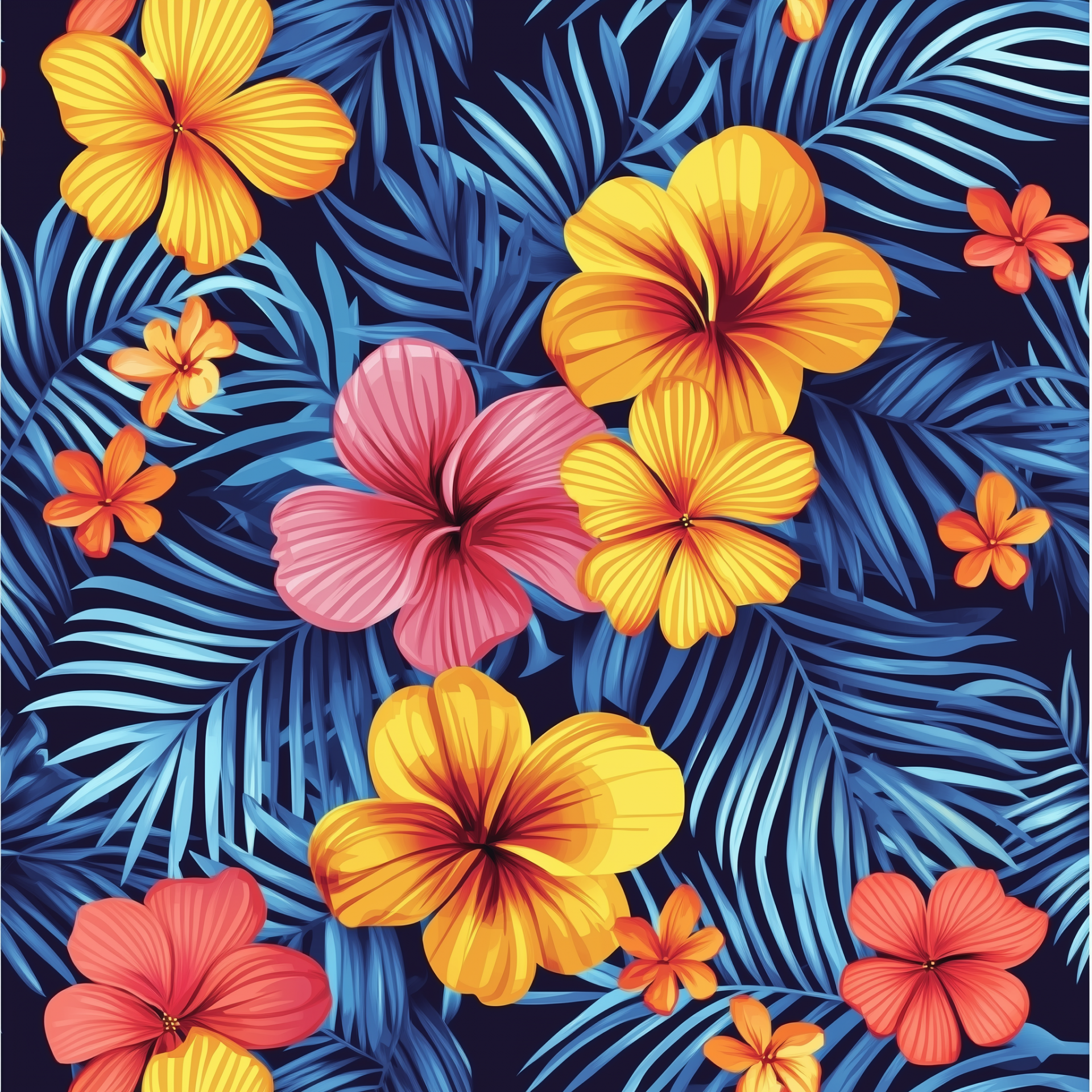 This illustration features a vibrant tropical floral print with a mix of colorful flowers and lush palm leaves. The design is seamless and can be continued on all four sides, creating a harmonious and lively pattern.