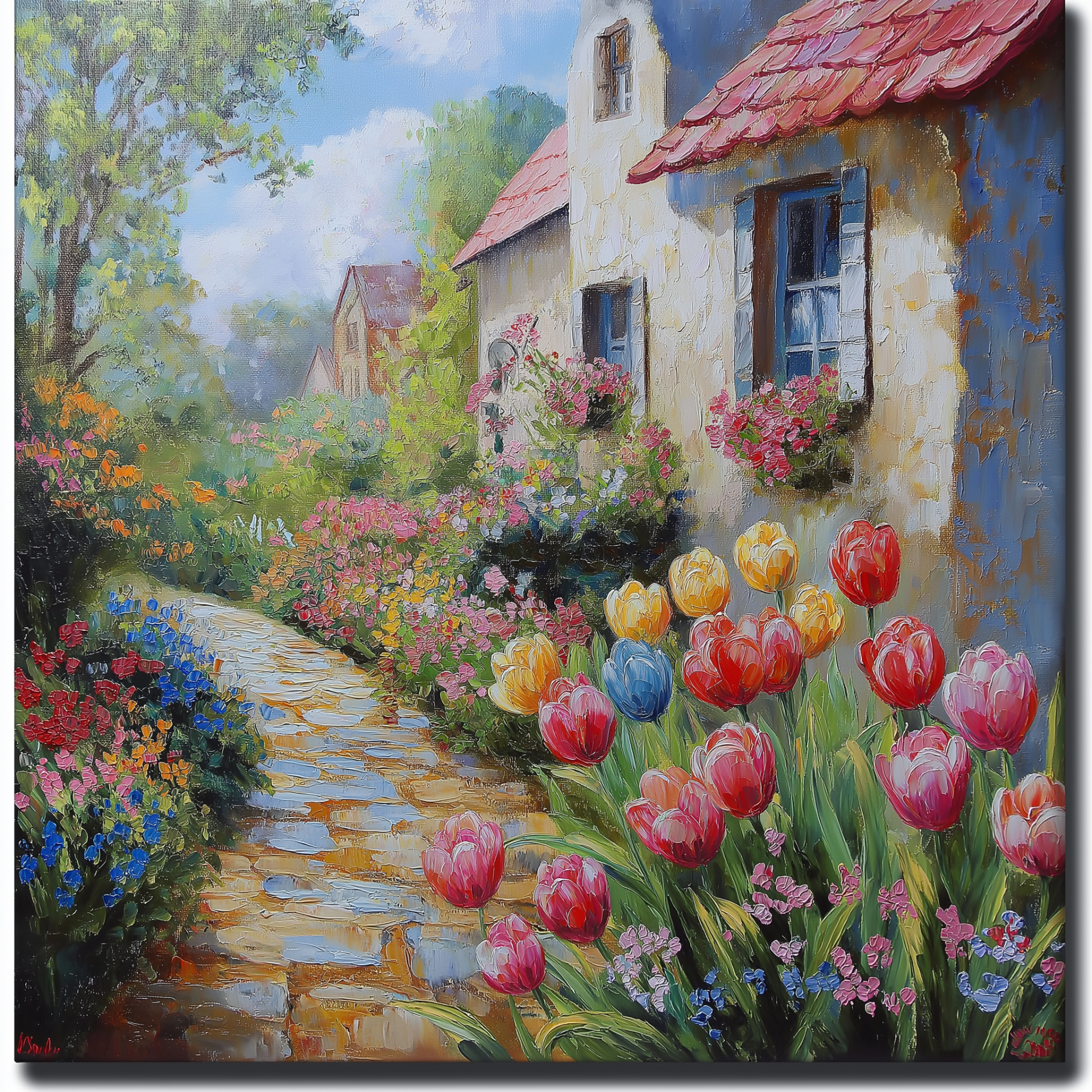 This illustration showcases a vibrant and colorful scene of tulips set in a charming cottage garden. The design exudes a warm and inviting ambiance, perfect for adding a touch of nature to various living spaces.