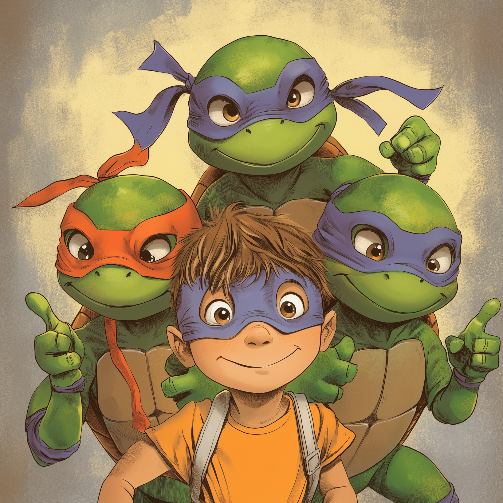 The invite features a vibrant illustration of all four ninja turtles celebrating a joyful birthday party. A cheerful five-year-old boy with sandy brown hair and a turtle eye mask joins them, capturing a whimsical and playful atmosphere reminiscent of Ghibli style.
