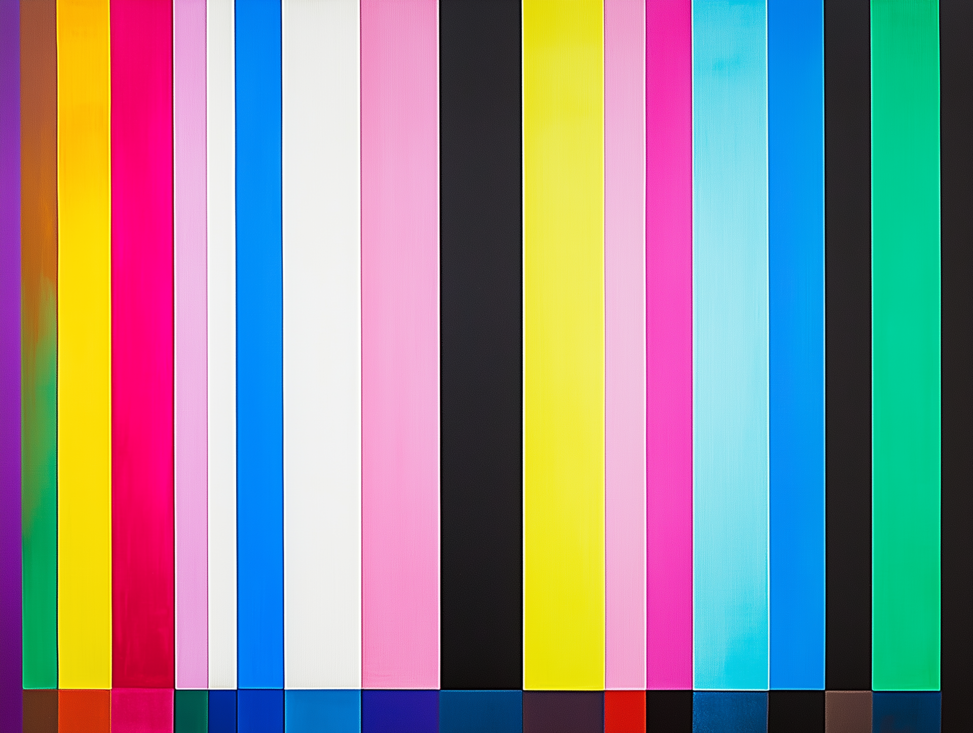 This image features a flat color television screen displaying a vibrant test pattern. The striking black and white lines contrast with the vivid colors surrounding them, creating an eye-catching high-resolution effect.
