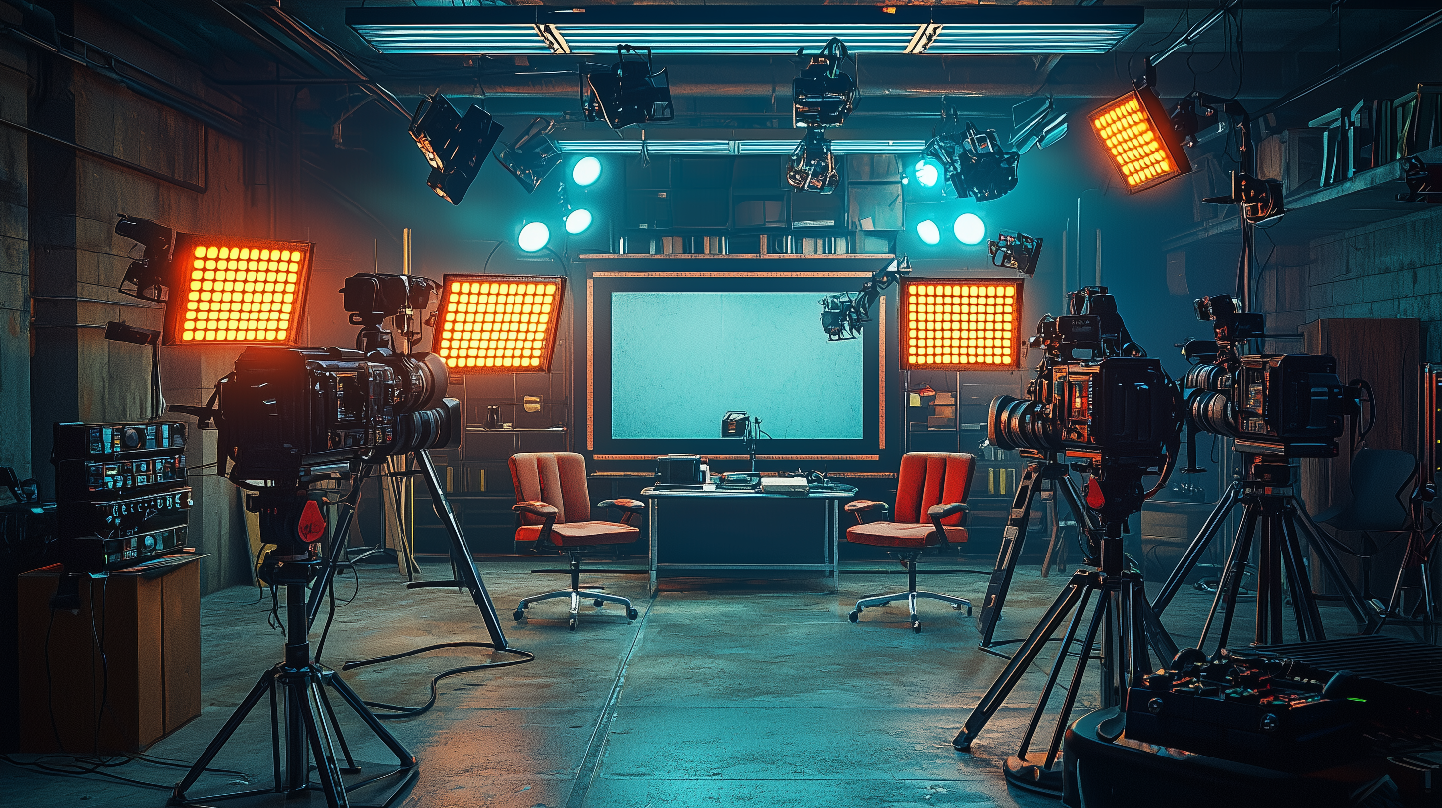 The image showcases a compact television studio designed for news reporting. It features professional cameras, bright lighting, and microphones, creating a vibrant and engaging atmosphere.