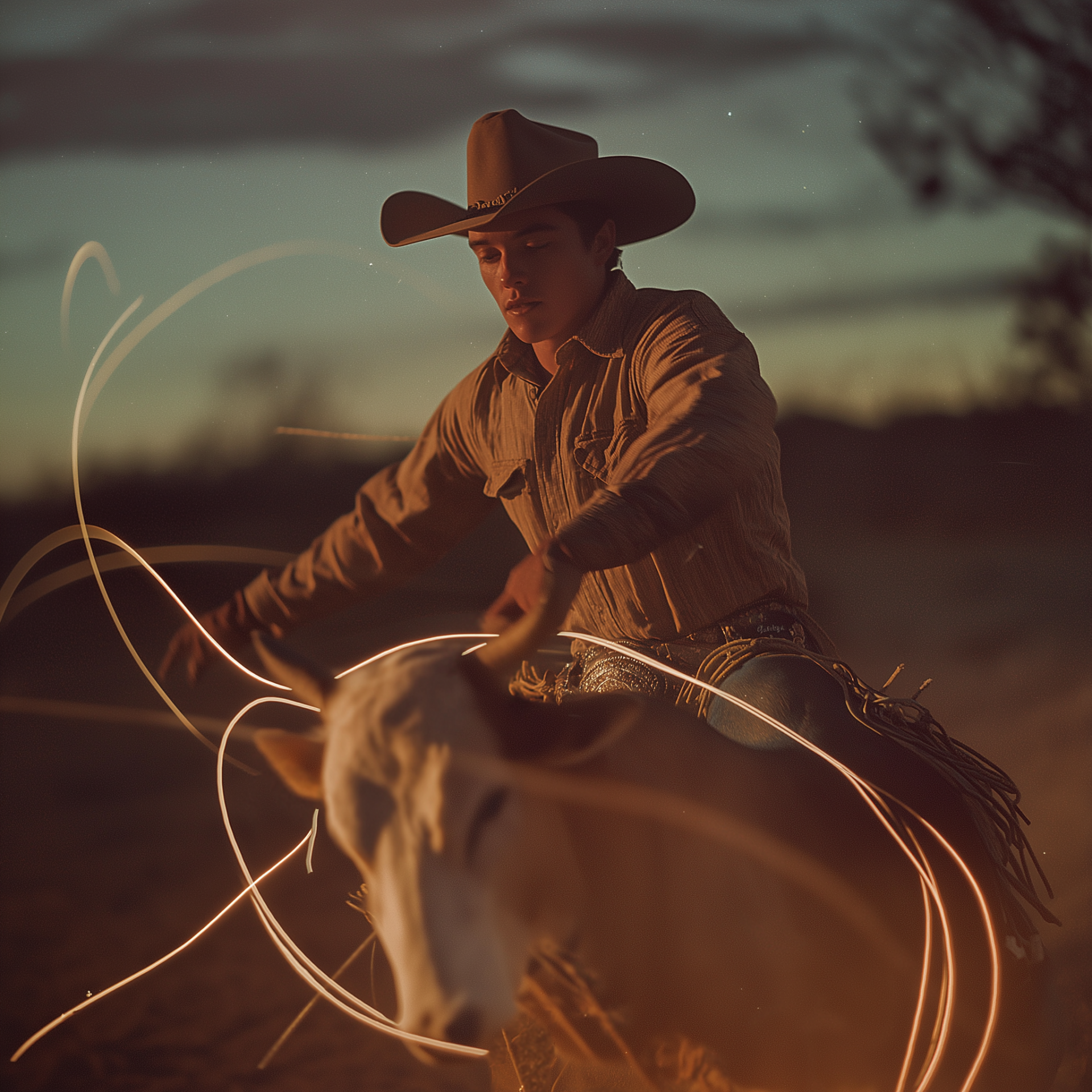 This grainy photograph captures a young cowboy caught in action, expertly roping a steer during twilight. The dramatic lighting and long exposure create a mesmerizing effect, enhancing the rugged atmosphere of the scene.