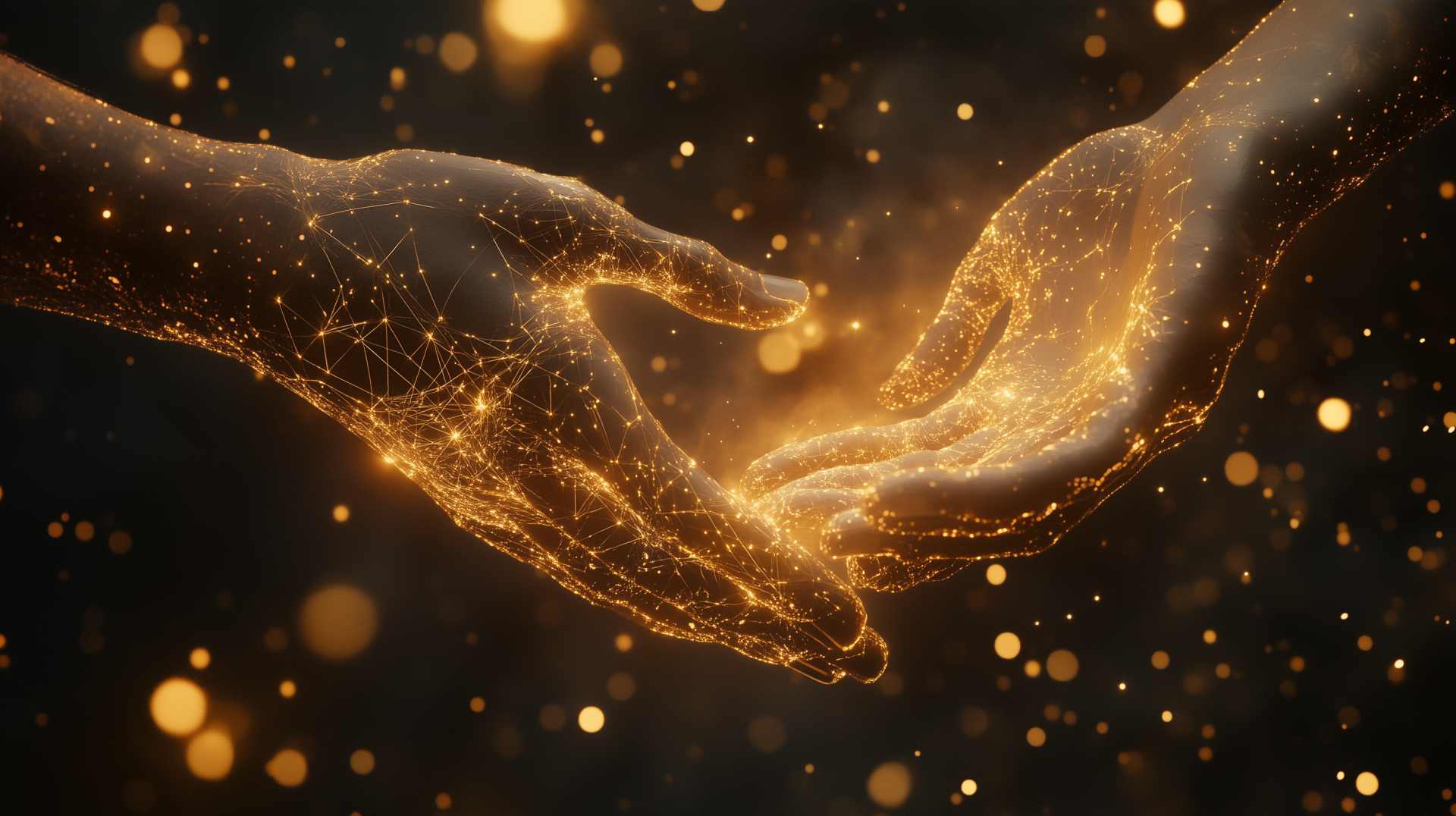 The image portrays a stunning and majestic representation of the universe cradled in radiant, bronze hands. The rustic styling complements the glowing cosmic elements, evoking a sense of cosmic divinity and connection.