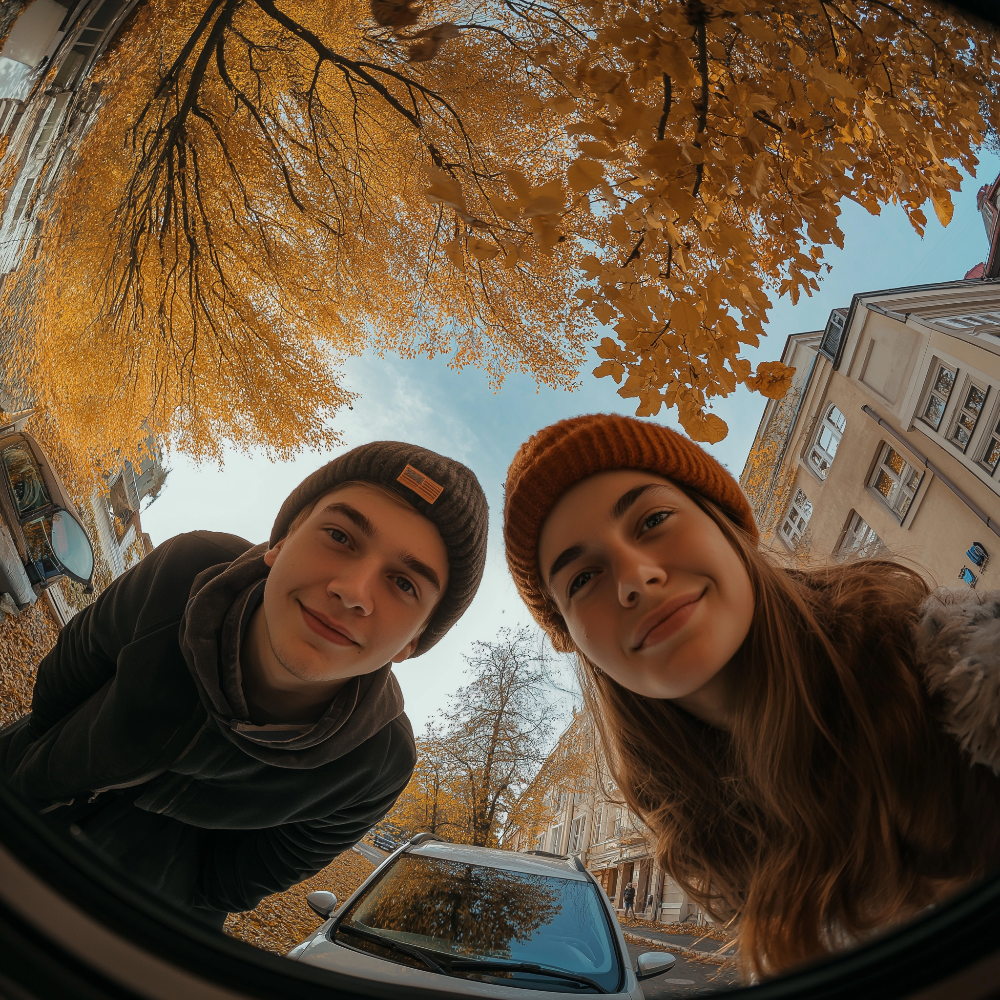 This image captures a cheerful young couple posing for a wide-angle selfie in an urban setting. The autumn backdrop features golden trees and a parked car, evoking a warm, vibrant atmosphere.