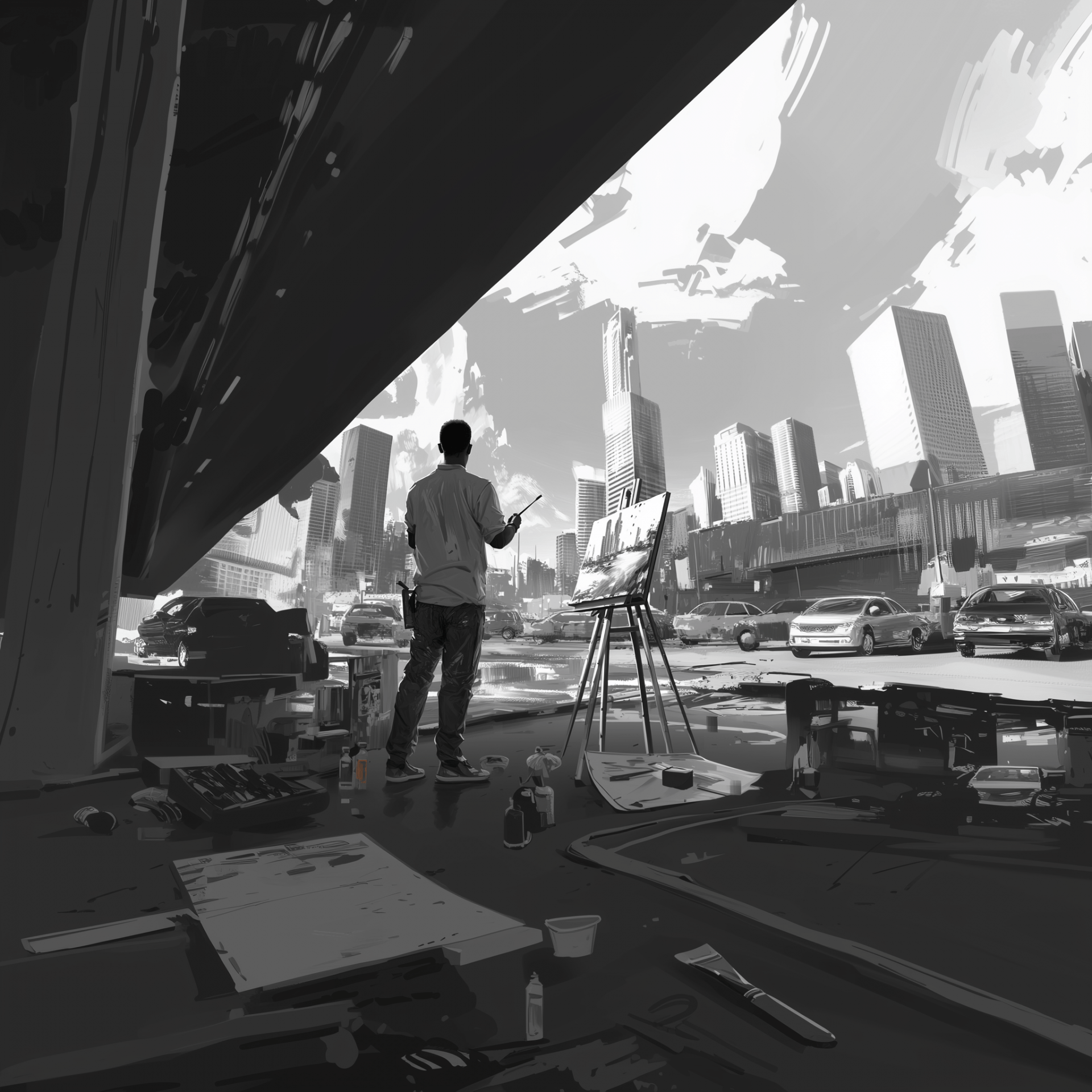 The image captures a dynamic wide shot of a young black male artist passionately painting on a canvas in an urban parking lot. The illustration features a monochrome pencil sketch style, emphasizing the artistic process and the surrounding cityscape.