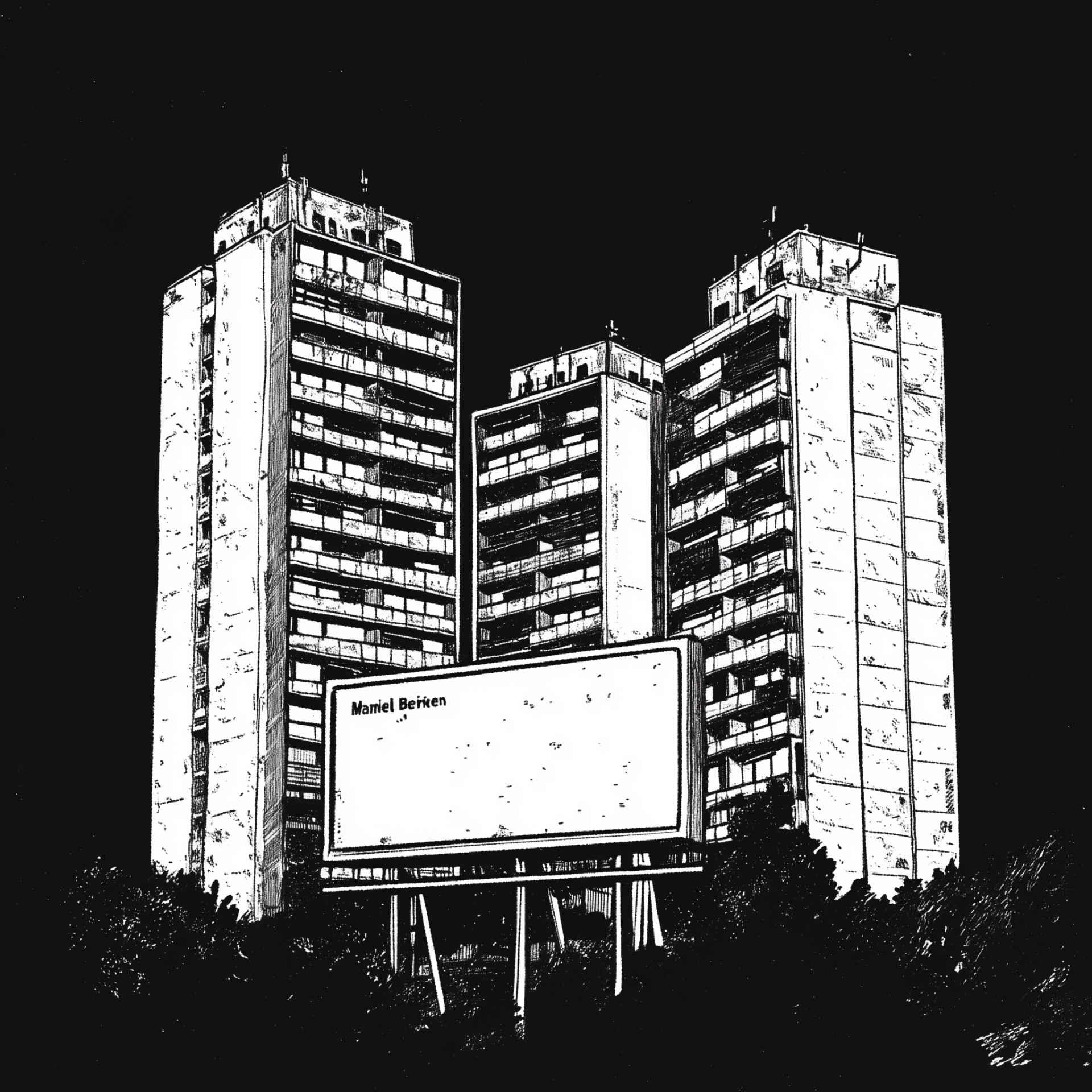 The image features three high-rise plattenbau buildings illustrated in a cartoon style, rendered in black and white reminiscent of a comic book. With bold lines, the buildings create a staggering effect and convey a sense of needing renovation.