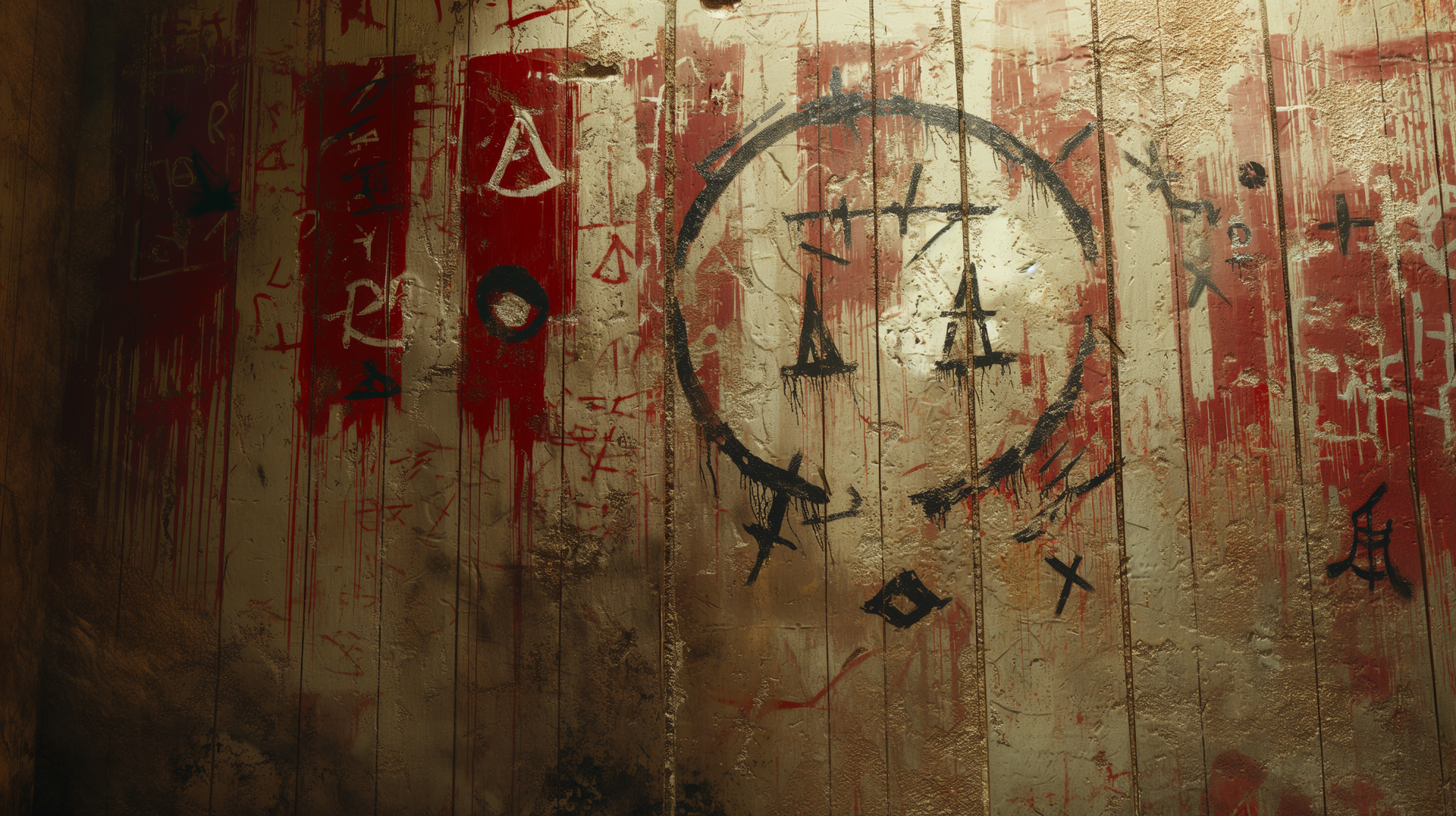 This image features a textured wall filled with various rebellious symbols sprayed in vibrant colors. The rough edges and the blend of red and beige create an intense and edgy atmosphere, perfect for a background.