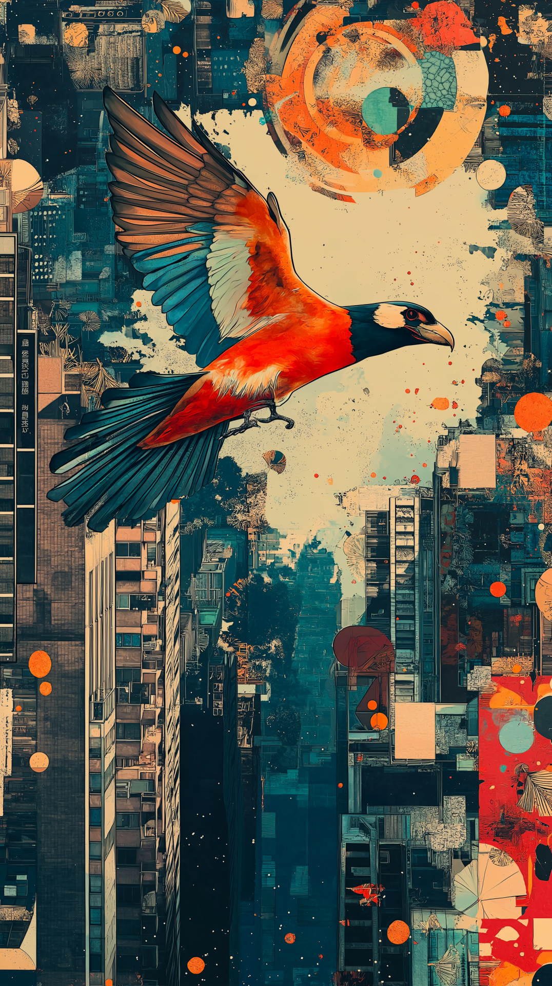 The artwork features a dynamic collage of a bird in flight against a backdrop of a cityscape. It blends elements of modern Japanese pop art and manga, creating a vibrant and abstract composition.